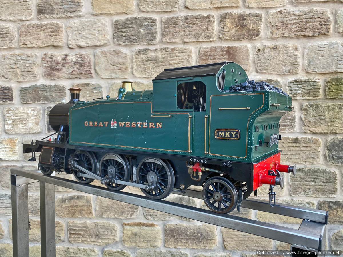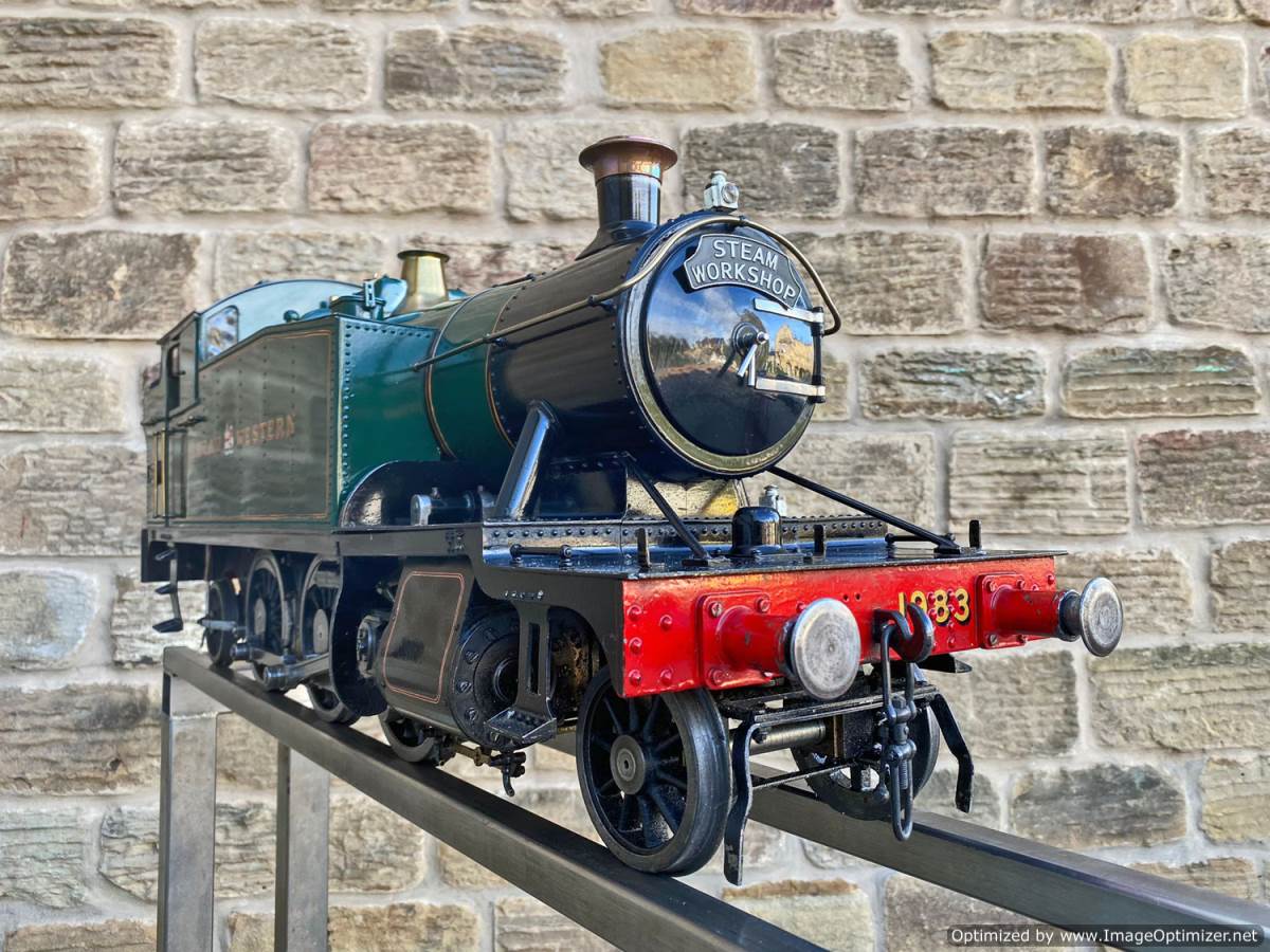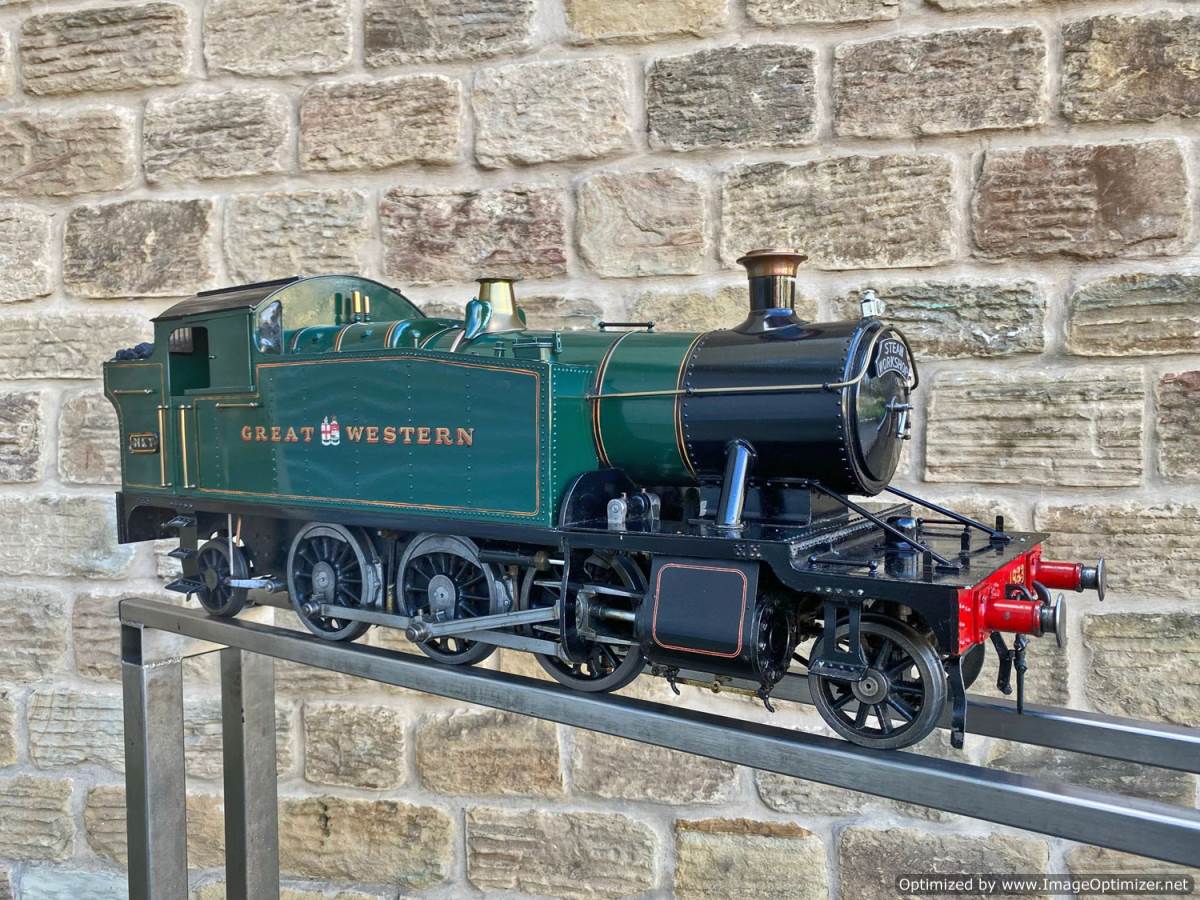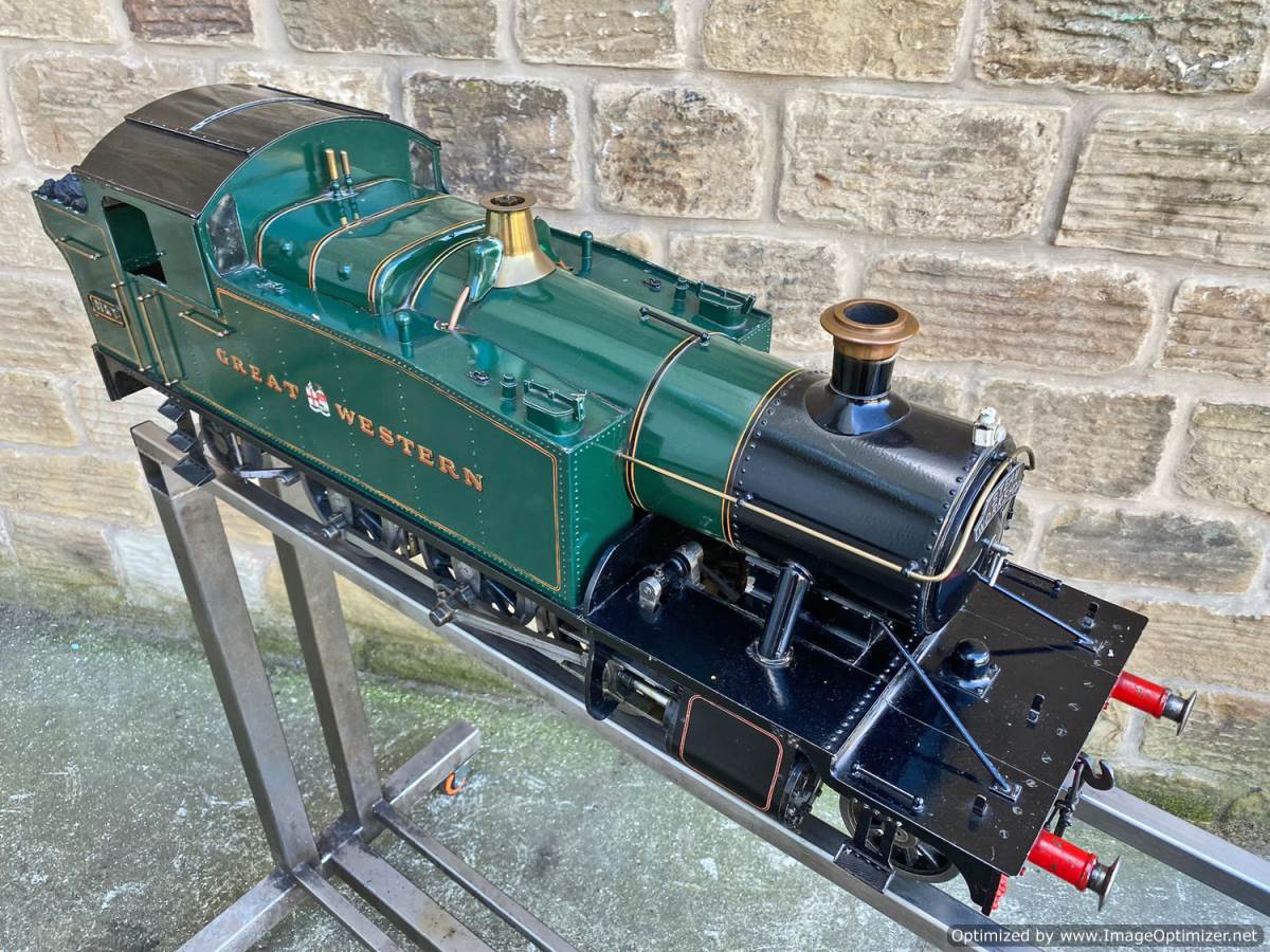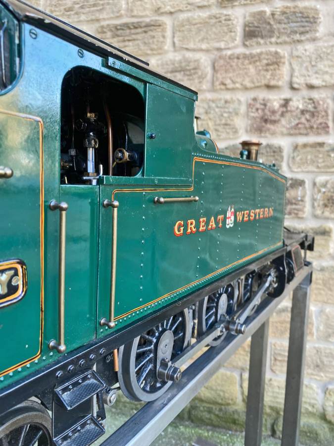 Here we have a 5" GWR 45xx prarie tank, made to the well respected 'firefly' design. Built by Ken Young, an extremely capable model engineer responsible for the 5" Black 5 and the 3 1/2" Britannia that we also have in stock, and used as his running engine. As a result she's in used but well looked after mechanical condition.