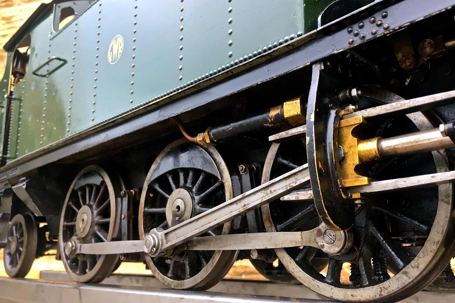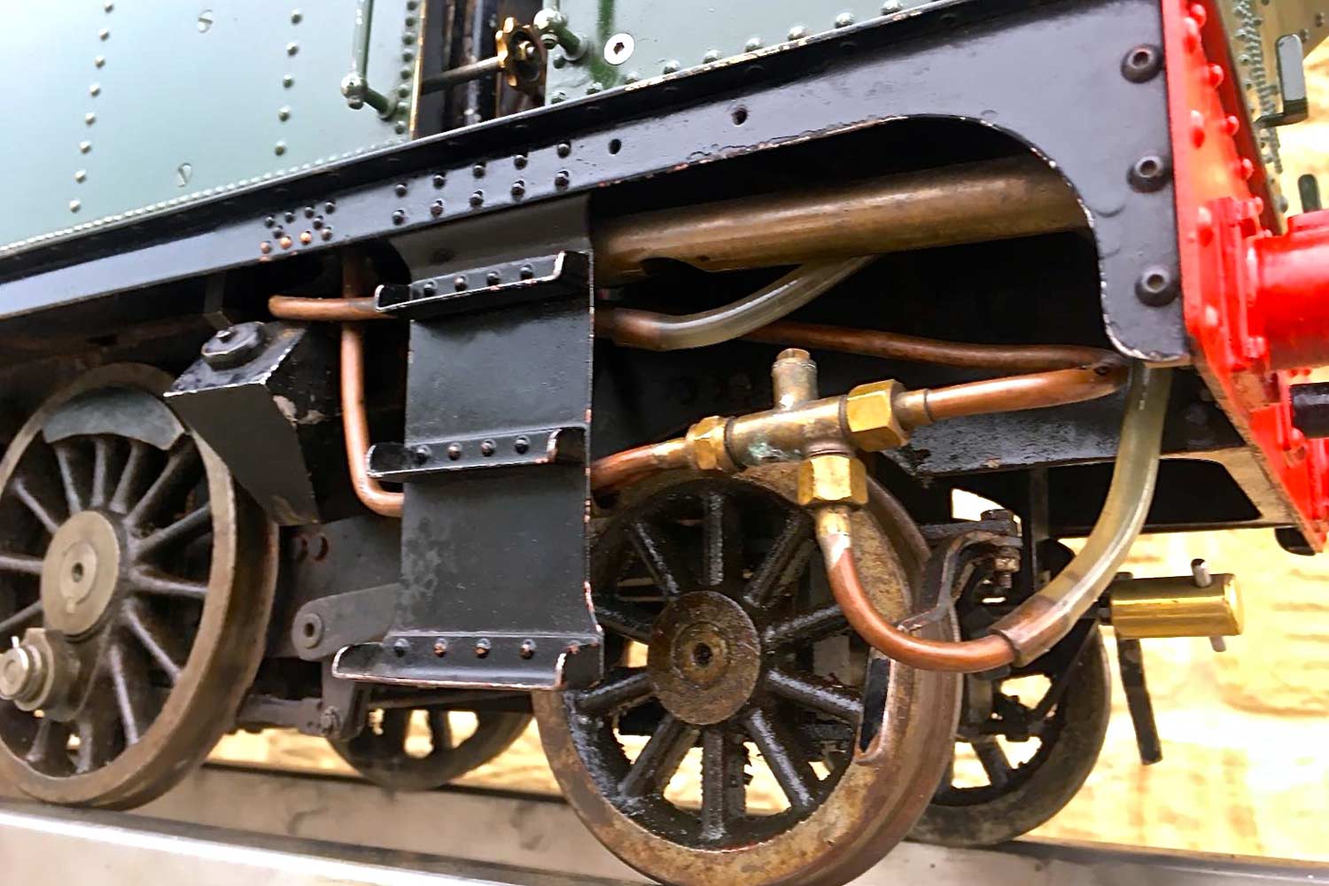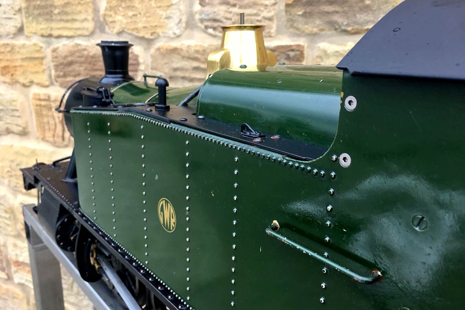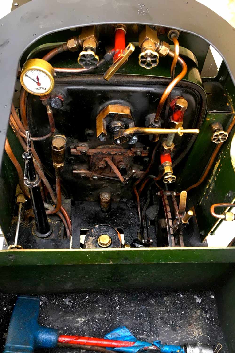 Whilst the paintwork definitely has the patina of a working loco,…. it has it’s fair share of shovel scratches and scuffs, the general appearance is purposeful and workmanlike rather than scruffy. It certainly doesn’t need a re-paint just yet! There is an injector, a hand pump in the tank and a crosshead water pump in the usual prototypical GWR location, with footplate mounted bypass valve. Draincocks are footplate operated, and lubrication on this one is via a large displacement reservoir under the footplate floor and regulateable sight feed glass in the cab.