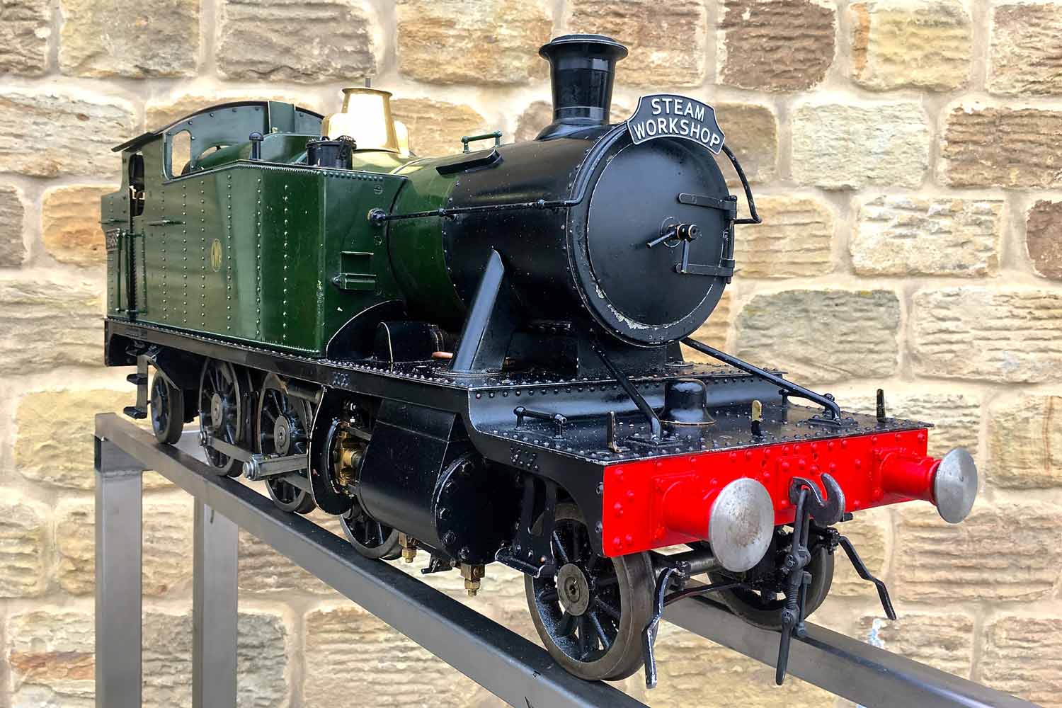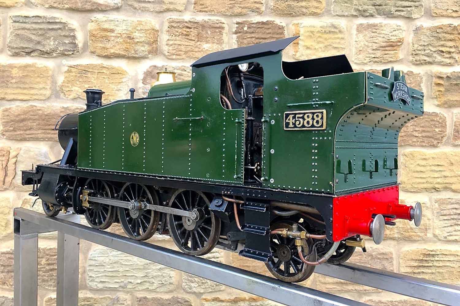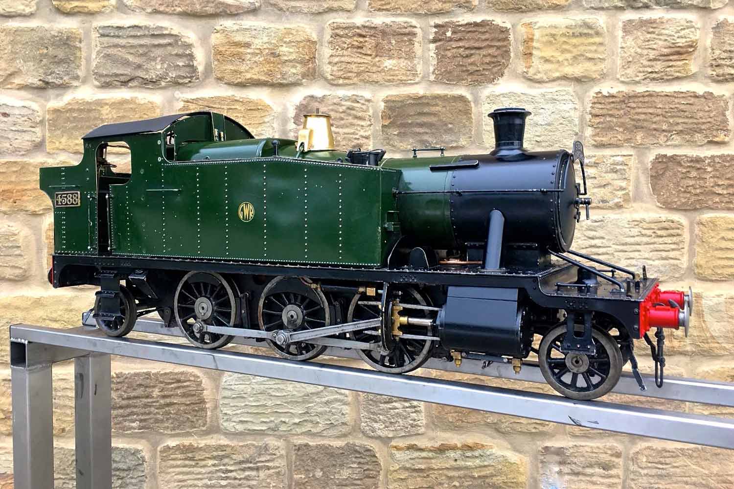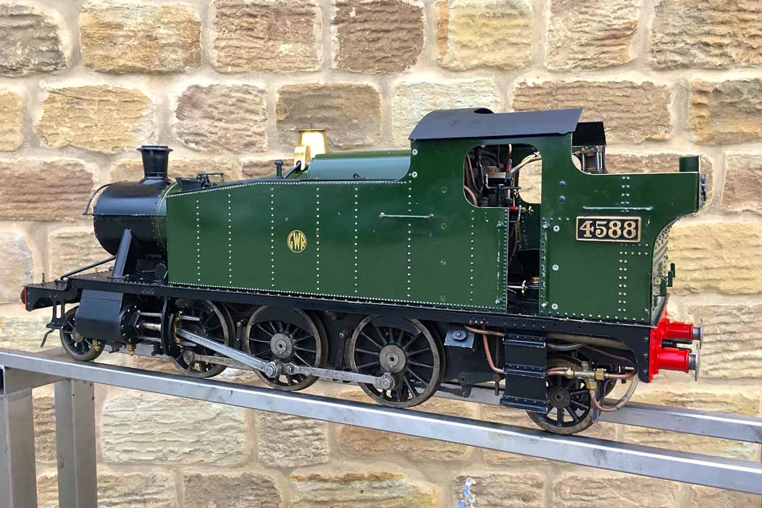 Here we have a 5″ gauge GWR small prarie tank 45xx, or rather 4575 class. We’ve sold this one before, and it’s recently come back into stock due to it’s owner moving on to other toys! Based upon a Winson/Modelworks kit, this one has been extensively re-worked mechanically to turn it into the well proven hauler that it is. The previous owner had a fetish for pulling lots of wagons, so things have been fettled and tweaked to ensure the loco was satisfyingly capable in that department.