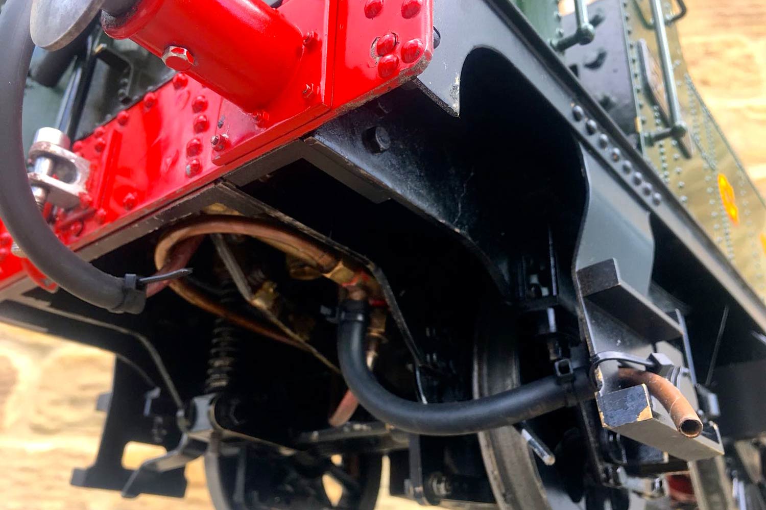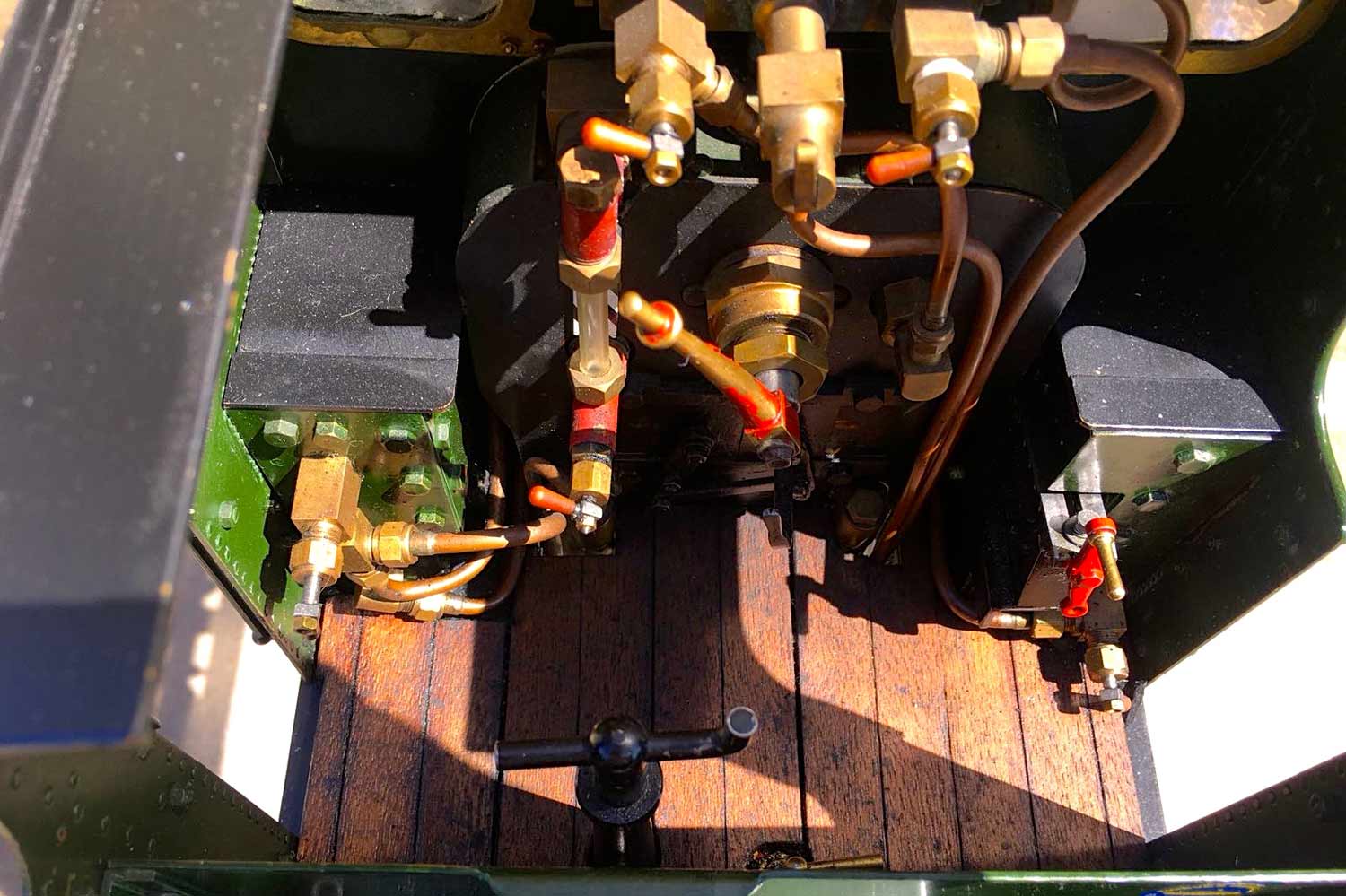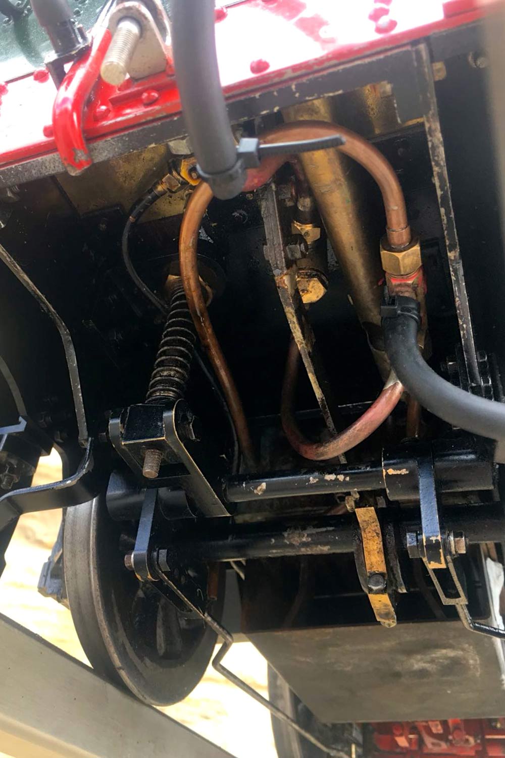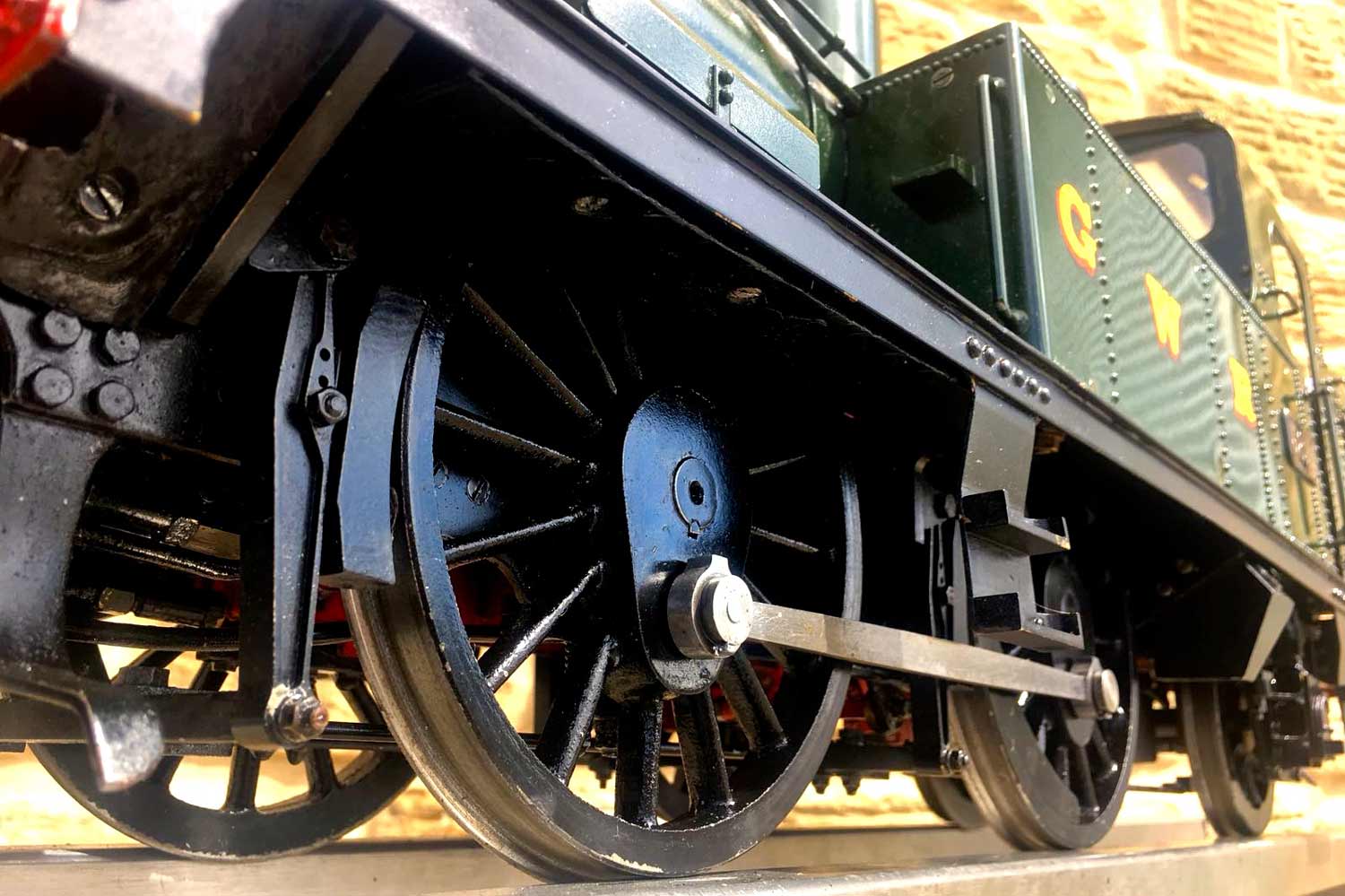 The boiler is of course professionally made, silver soldered copper and has very few steamings under it's belt. Lubrication is mechanical and hidden in the bunker as per the kit design. There is an injector, a mechanical pump with bypass valve on the footplate, and a hand pump in the tank. There are a few nice extra detailing bits, the addition of washout plugs on the boiler and firebox is a nice touch, as is the modification of the screw reverser to be actually in essence a lever one in disguise. This is a nice little GWR 14xx that ought to give you lots of pleasure trundling round your track.