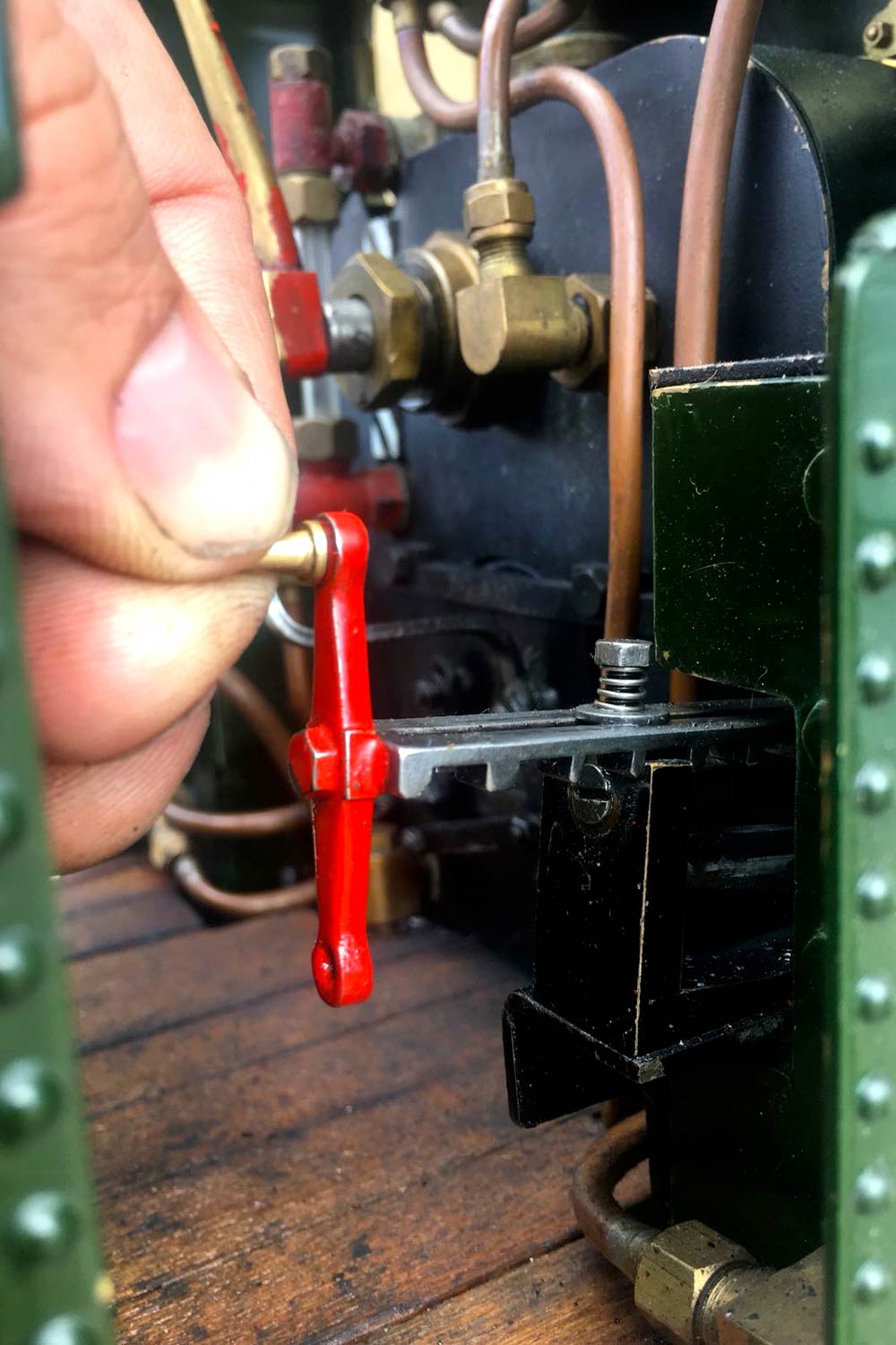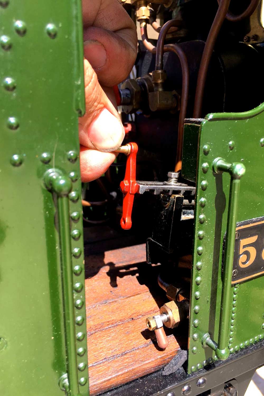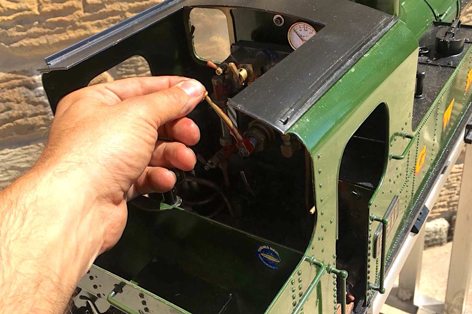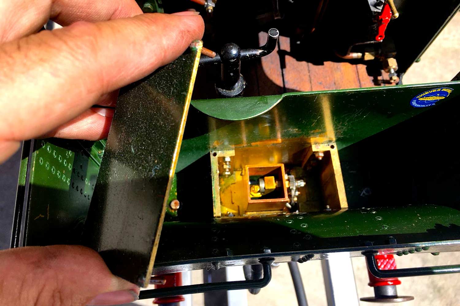 The boiler is of course professionally made, silver soldered copper and has very few steamings under it's belt. Lubrication is mechanical and hidden in the bunker as per the kit design. There is an injector, a mechanical pump with bypass valve on the footplate, and a hand pump in the tank. There are a few nice extra detailing bits, the addition of washout plugs on the boiler and firebox is a nice touch, as is the modification of the screw reverser to be actually in essence a lever one in disguise. This is a nice little GWR 14xx that ought to give you lots of pleasure trundling round your track.