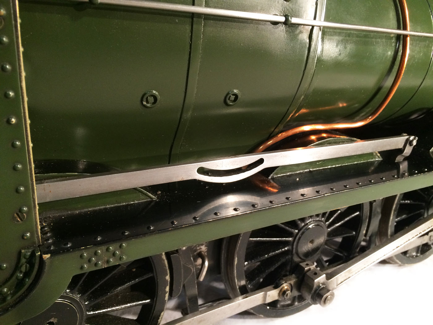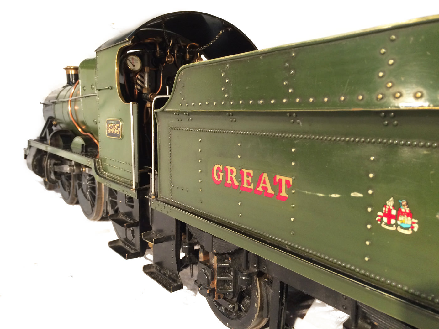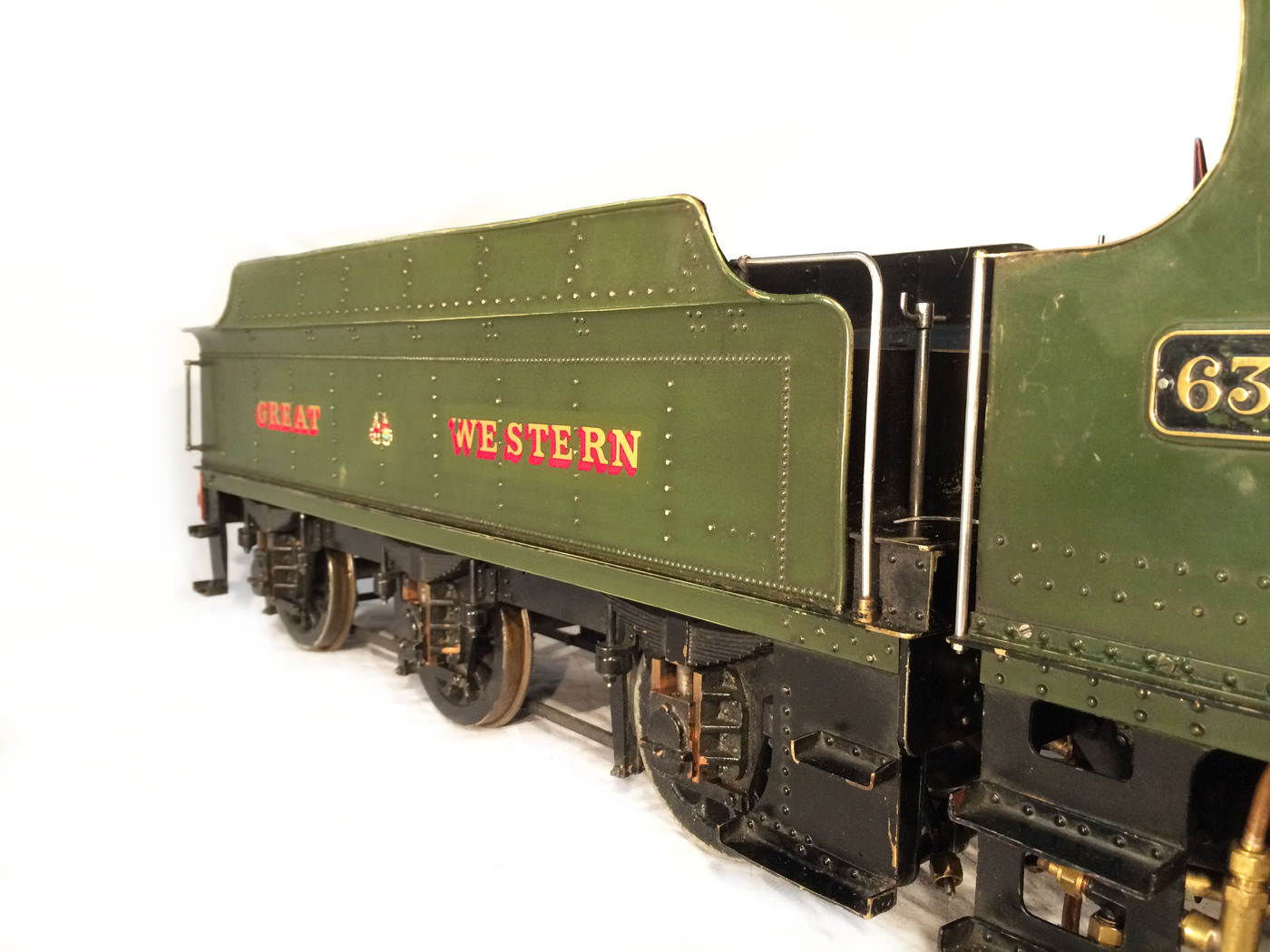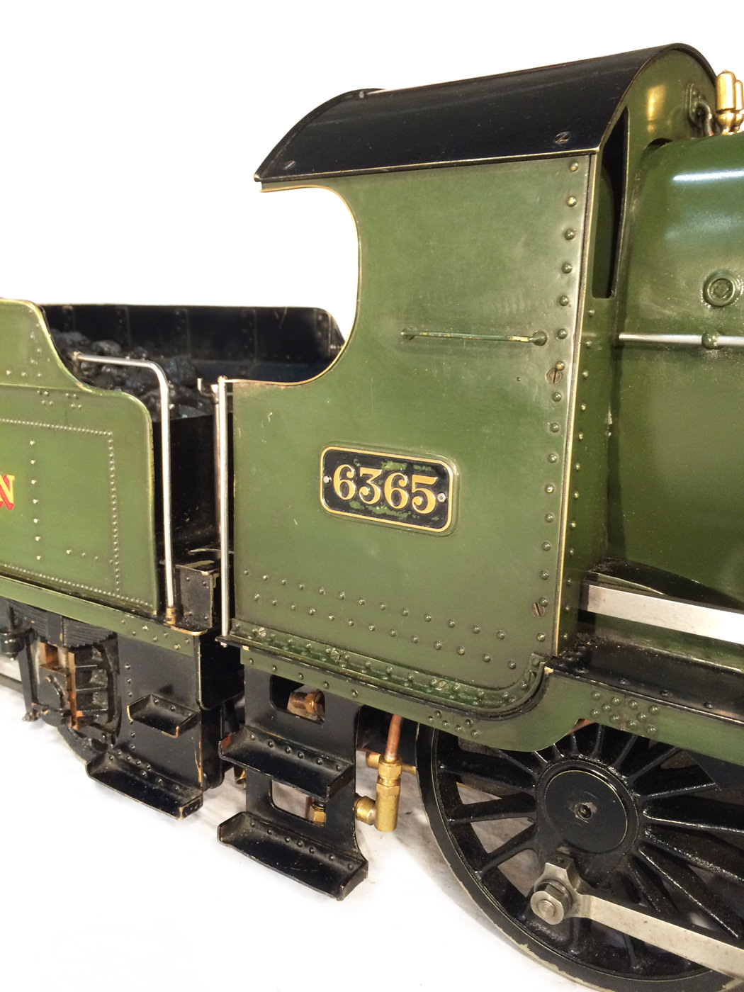The model it's self then has all the usual things you'd expect for a well resolved running loco. Lubrication is from a nice big mechanical lubricator hidden under the front running board. The draincocks are footplate operated, as are the twin injectors,.... and the twin GW style whistles! Unusually for a tender engine of this size, the 63's were pole reverser engines, which makes this model particularly versatile. If you fancy getting involved with the GL5 scale train crowd on their 'Main Line' running days, this would be a superb engine to both shunt the yards, and then look great on the front of 30 scale wagons round the main circuits!