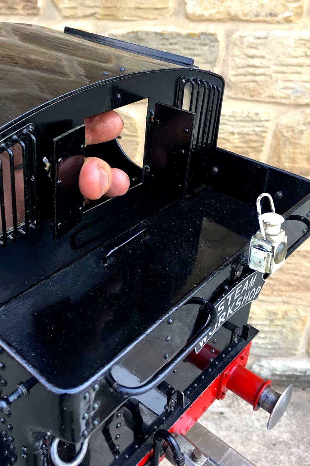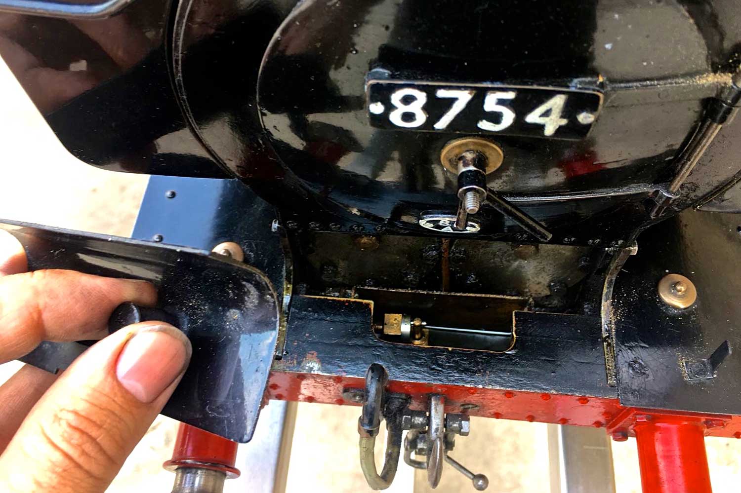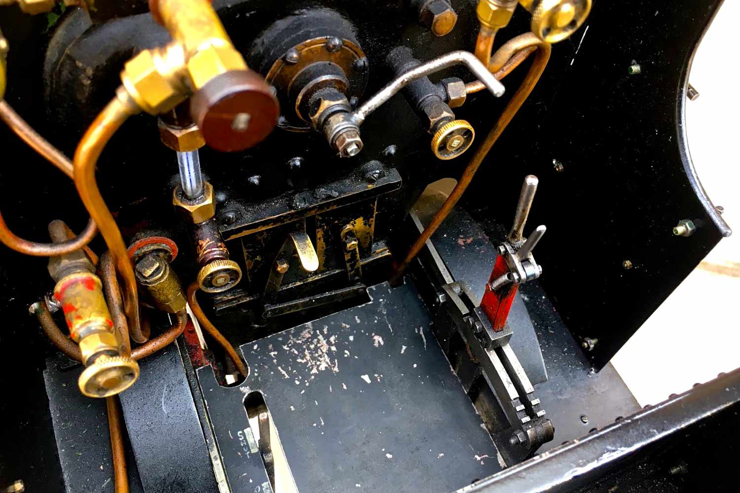 Water is supplied through an injector, as well as an axle pump between the frames with footplate mounted bypass valve and of course a hand pump as well,.... in this case tucked away neatly under the rear bunker floor, and with a wooden handle attached and hidden under a removable panel. Lubrication is mechanical and as per usual hidden under the front running boards. All in all, the paintwork is quite nice and tidy with the odd paint scuff and chip having been sympathetically touched in over the years. A well looked after and nicely presented Pansy, all sorted and ready to play.