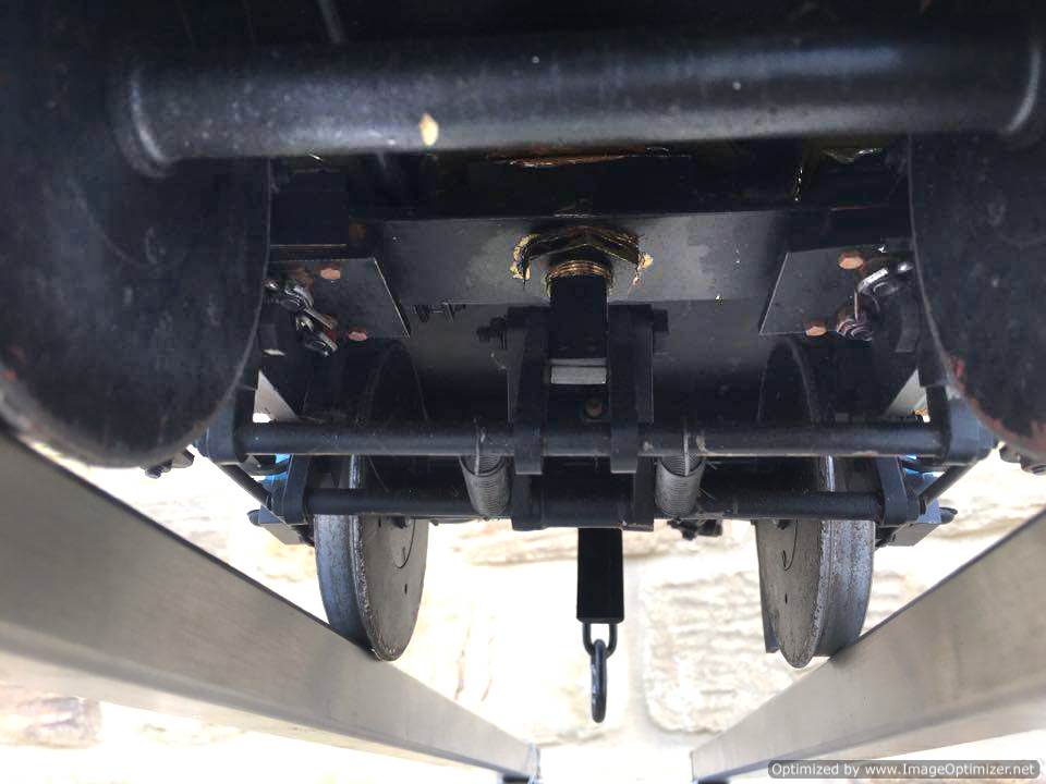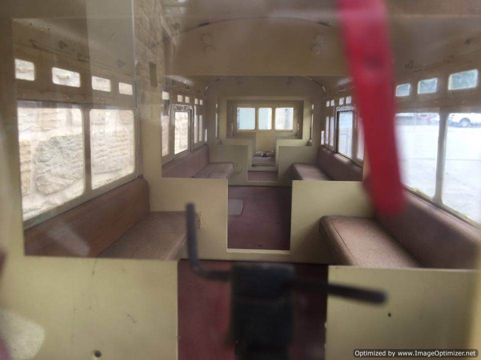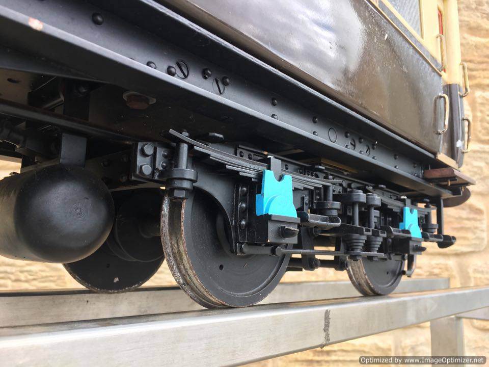The body and roof are laser cut from steel, and thick steel sheet at that, so this is a model of some substance. You can easily load the roof with heavy adults, and it is a weighty two man lift. The bogies are both braked, and there is a shaft protruding through the frame where a lever can be attached to actuate them.