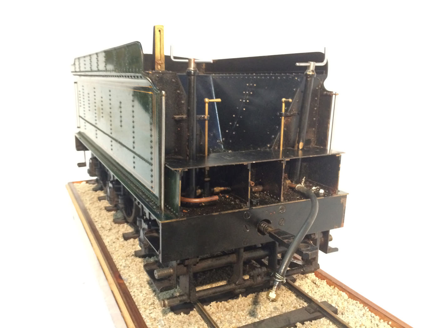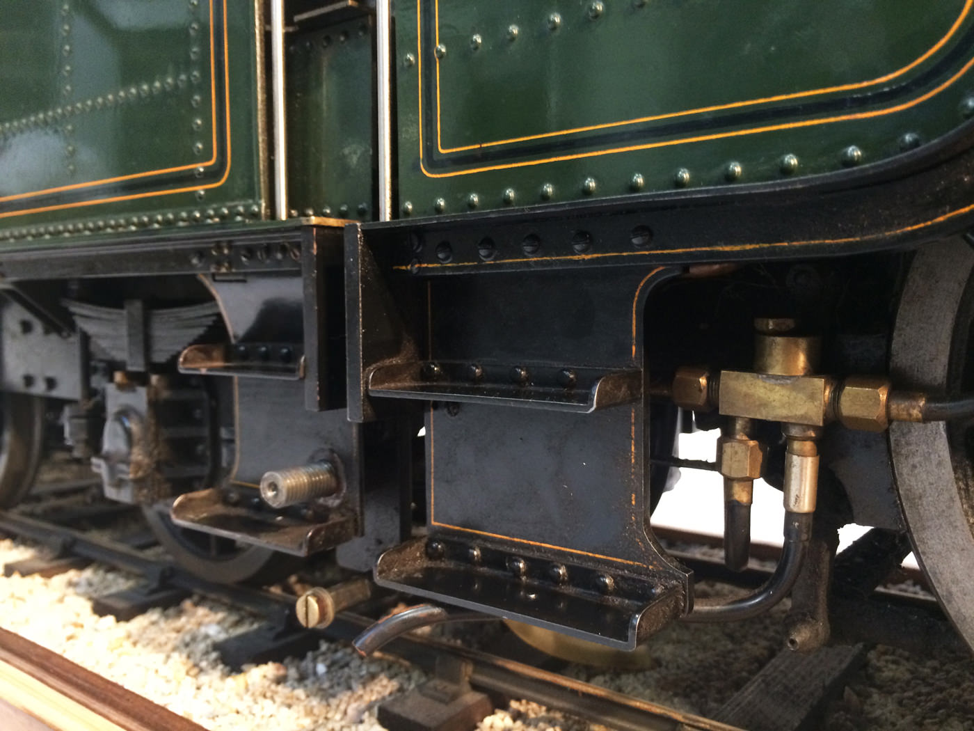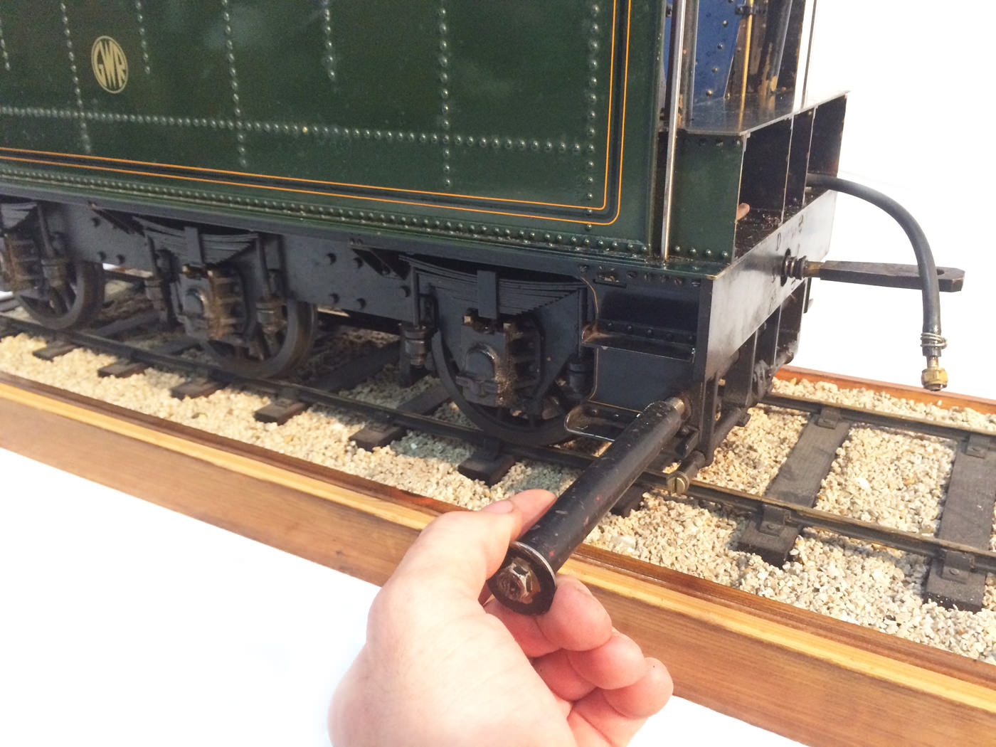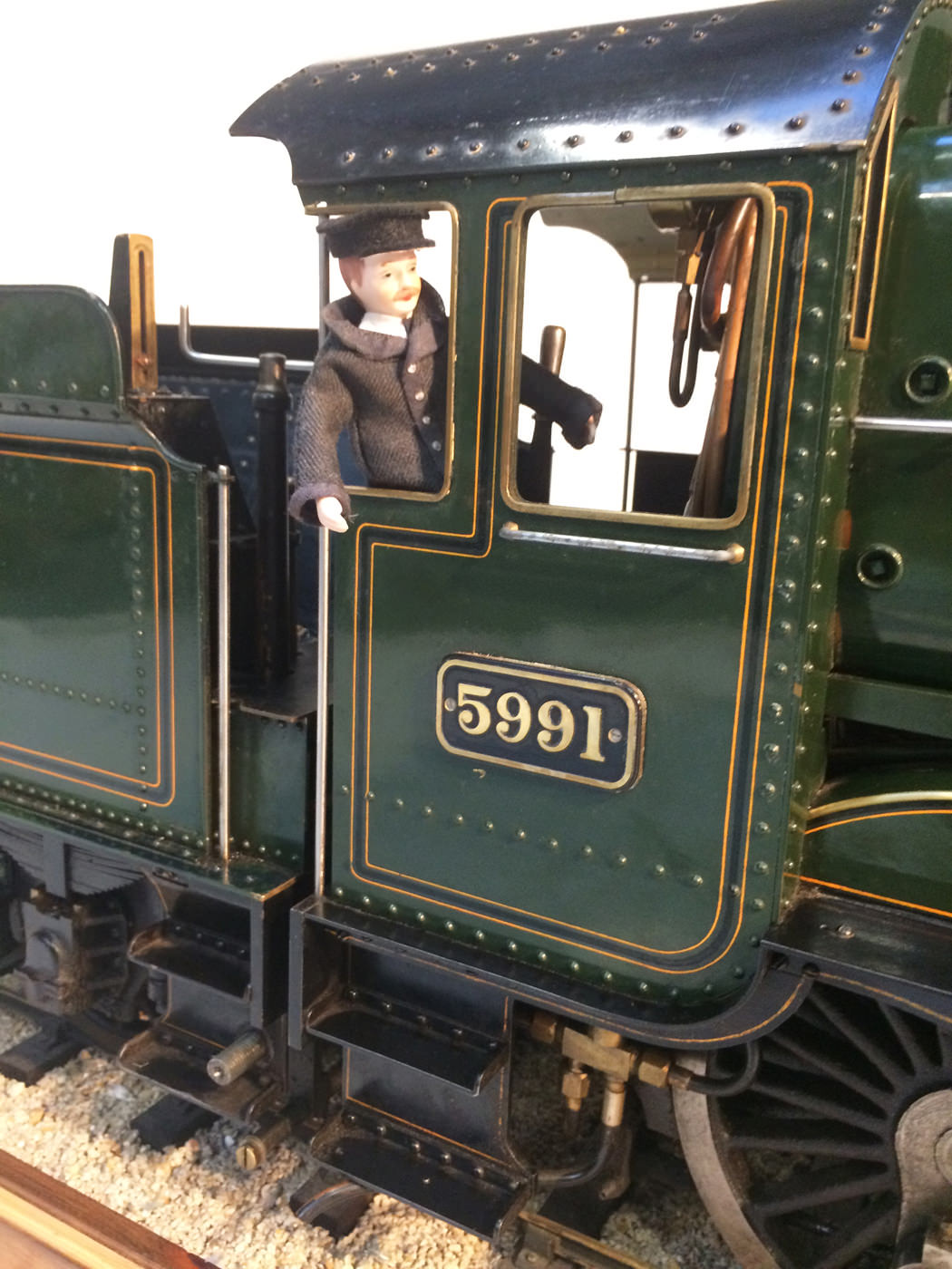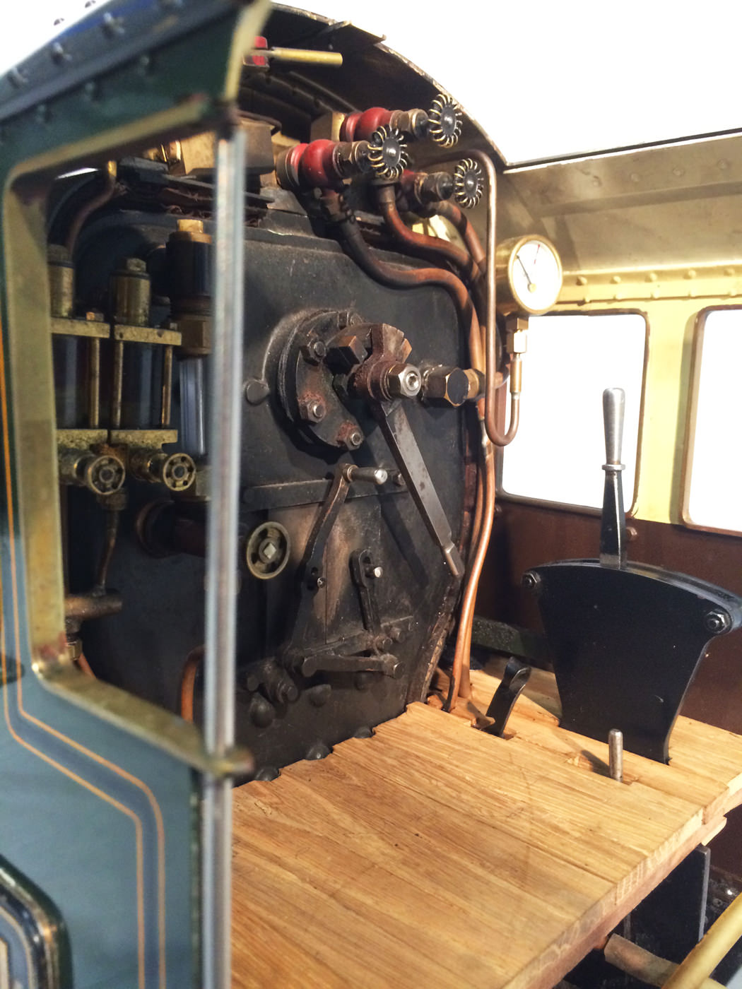 As implied, this is made to the Greenly drawings, and as such is not an absolutely perfect, prototypically accurate and detailed model.  That said, it's not far off, and is certainly a very nice looking and reliable steamer ready to perform.  There are twin injectors, a mechanical axle pump and of course the hand pump in the tender for the water.  Lubrication is through a displacement hydrostatic lubricator, feeding through twin sight feeds on the footplate.  Draincocks are of course footplate operated, and the reverser is quite an unusual sprung pole reverser.  You push down on the lever and it releases from a notch under the arc.  It's surprisingly comfortable to use, and certainly does away with all that winding if you intend using the loco on the ground level where points and the opportunity to shunt present themselves.  A great loco to perhaps get involved with the GL5 world!