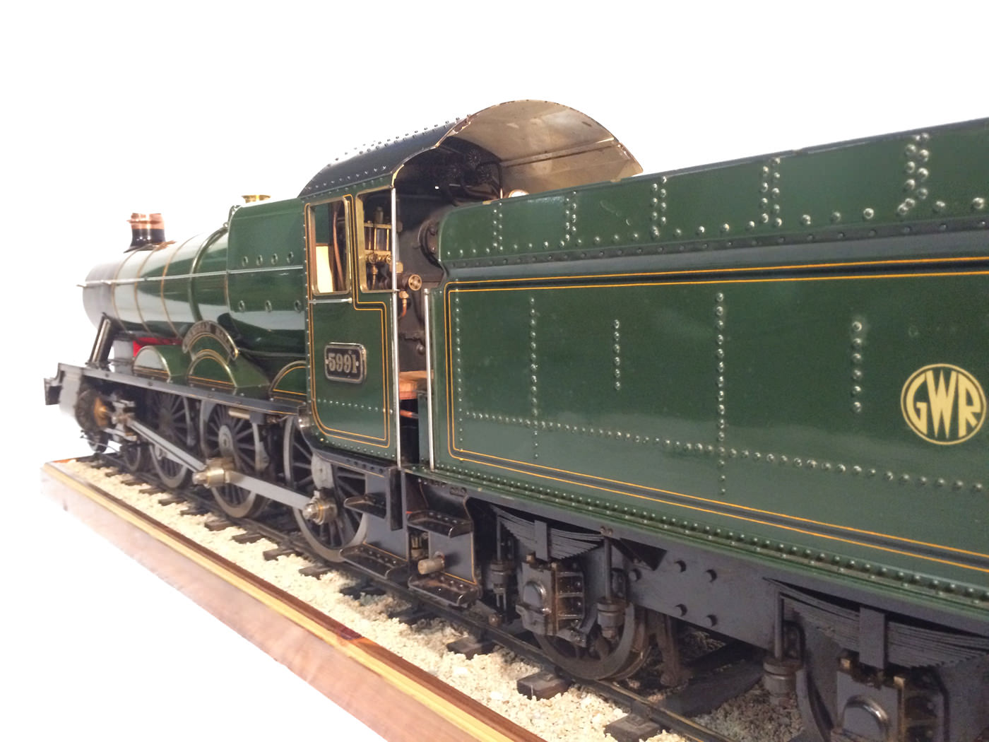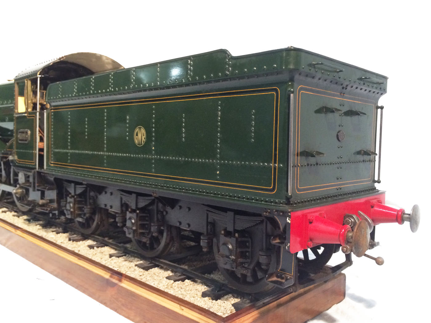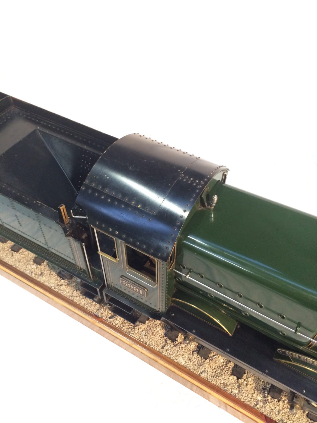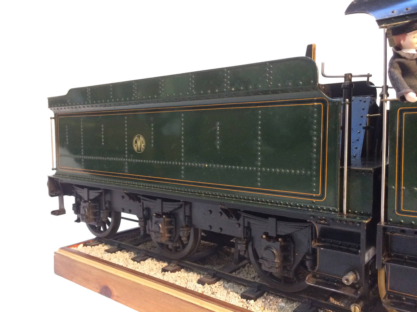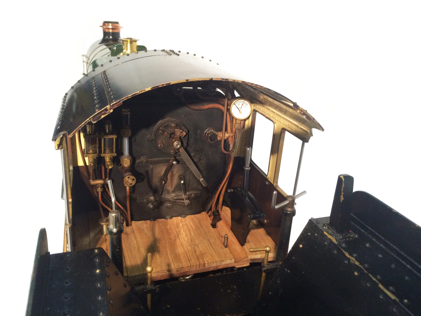 As implied, this is made to the Greenly drawings, and as such is not an absolutely perfect, prototypically accurate and detailed model.  That said, it's not far off, and is certainly a very nice looking and reliable steamer ready to perform.  There are twin injectors, a mechanical axle pump and of course the hand pump in the tender for the water.  Lubrication is through a displacement hydrostatic lubricator, feeding through twin sight feeds on the footplate.  Draincocks are of course footplate operated, and the reverser is quite an unusual sprung pole reverser.  You push down on the lever and it releases from a notch under the arc.  It's surprisingly comfortable to use, and certainly does away with all that winding if you intend using the loco on the ground level where points and the opportunity to shunt present themselves.  A great loco to perhaps get involved with the GL5 world!