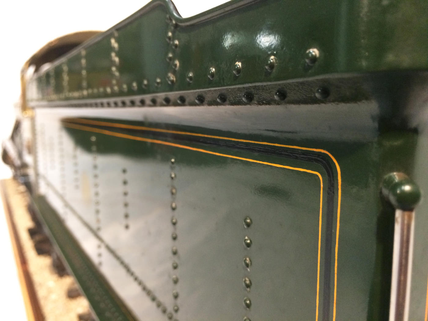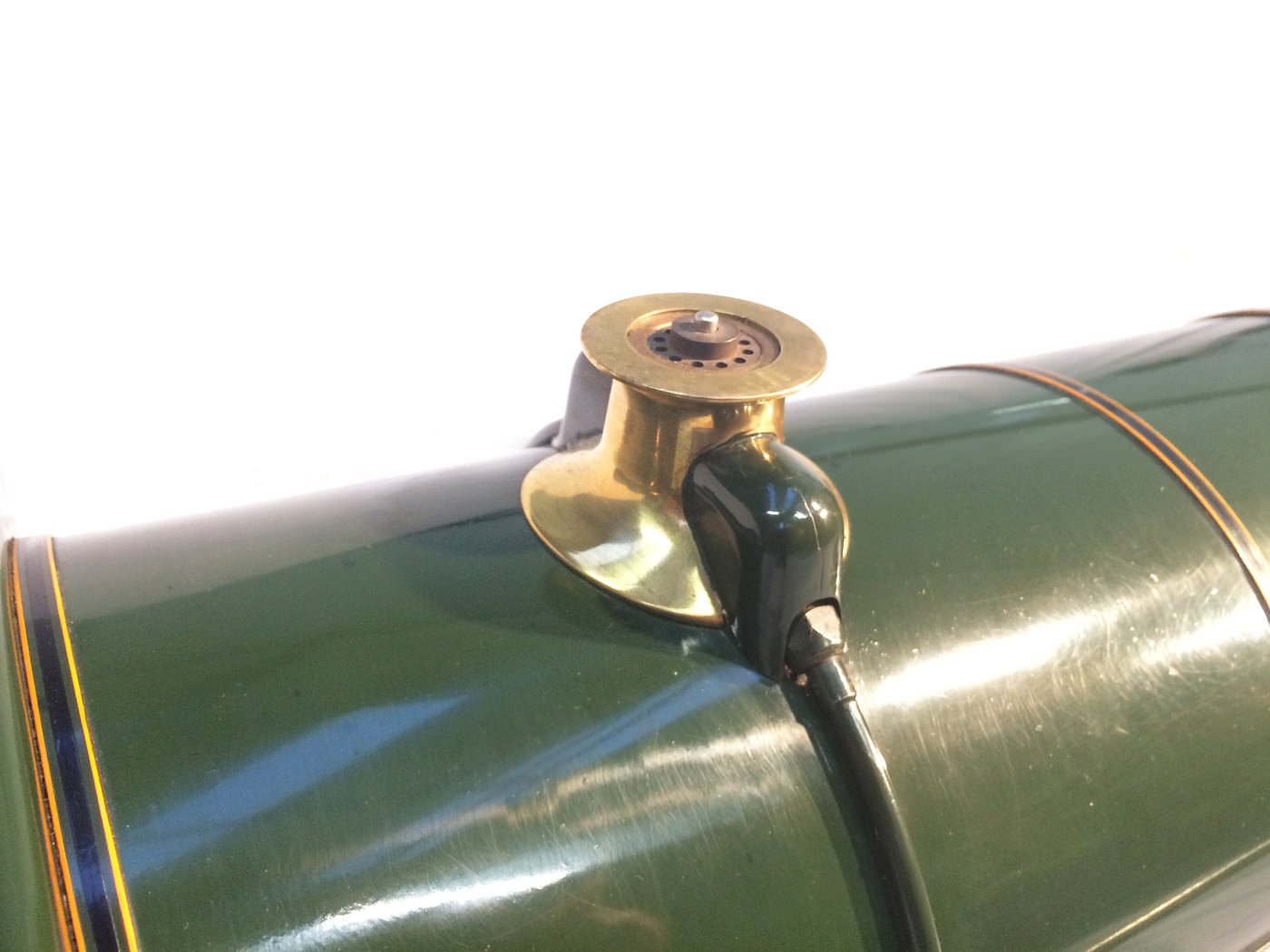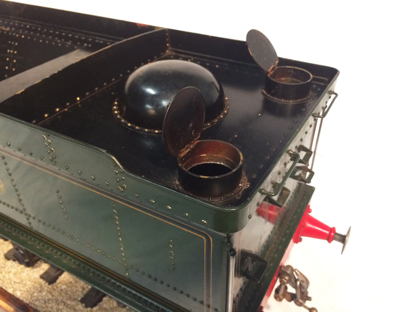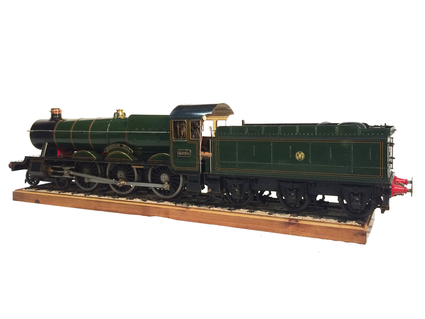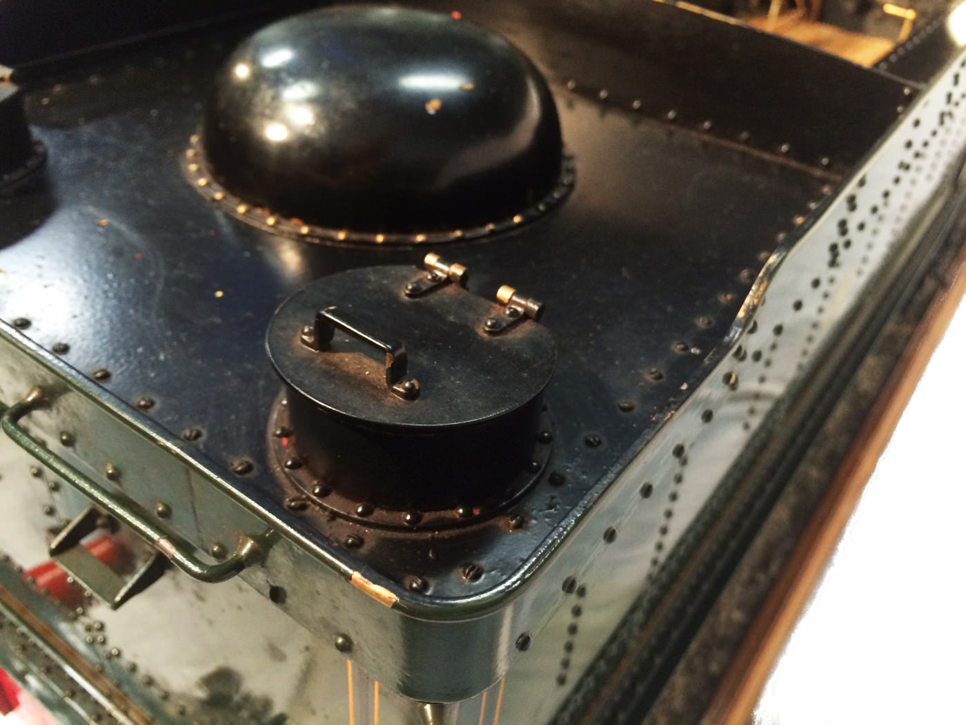 As implied, this is made to the Greenly drawings, and as such is not an absolutely perfect, prototypically accurate and detailed model.  That said, it's not far off, and is certainly a very nice looking and reliable steamer ready to perform.  There are twin injectors, a mechanical axle pump and of course the hand pump in the tender for the water.  Lubrication is through a displacement hydrostatic lubricator, feeding through twin sight feeds on the footplate.  Draincocks are of course footplate operated, and the reverser is quite an unusual sprung pole reverser.  You push down on the lever and it releases from a notch under the arc.  It's surprisingly comfortable to use, and certainly does away with all that winding if you intend using the loco on the ground level where points and the opportunity to shunt present themselves.  A great loco to perhaps get involved with the GL5 world!