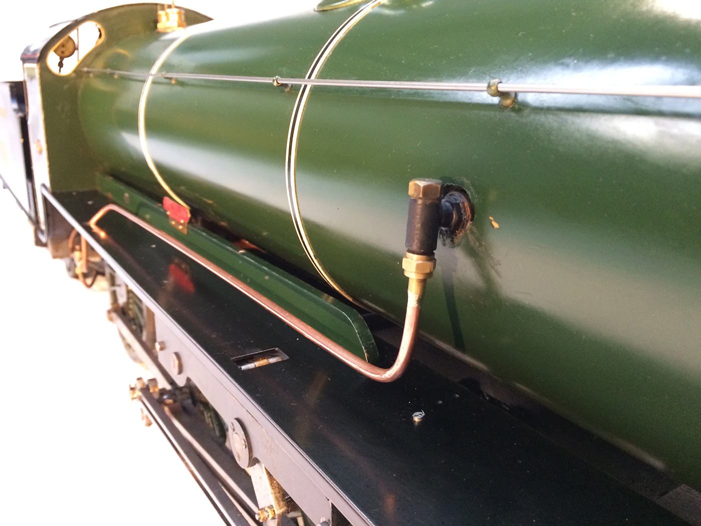 The model we have here is fully sorted and ready to play. Originally built with a steel boiler, she was re-boilered a few years ago with (as you'd expect these days) a new silver soldered copper boiler. There's twin injectors, and the usual 'incompetence' pump in the tender. (Just our little joke) Mechanical cylinder lubrication is from the usual ratchet pump hidden under the front running board.