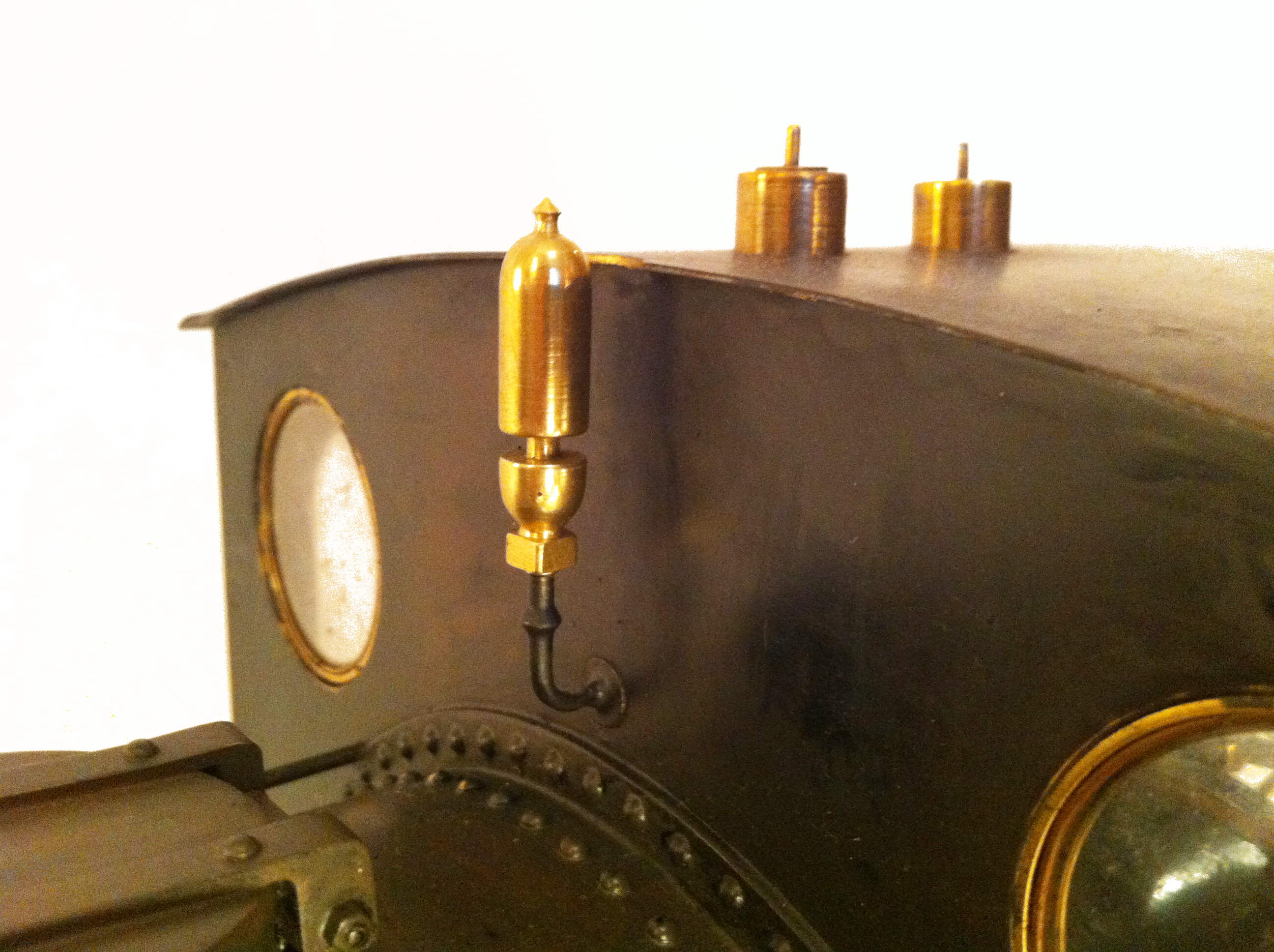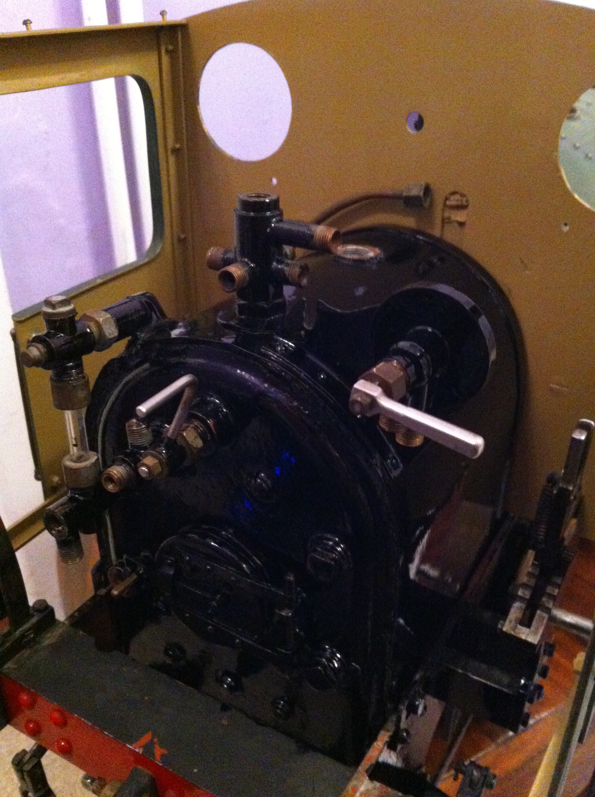 The Pug is fitted with an injector (from a driving truck), an axle water pump and bypass fed from, and returning to the tank and a subtle hand pump located underneath the running boards, but with the handle on the footplate. The draincocks are operated from the cab, and there is a very good, and graduatable steam brake fitted. The whistle is under the running boards, but the dummy whistle is plumbed in to the same feed so that it blows steam from the right places when you pull the lever.