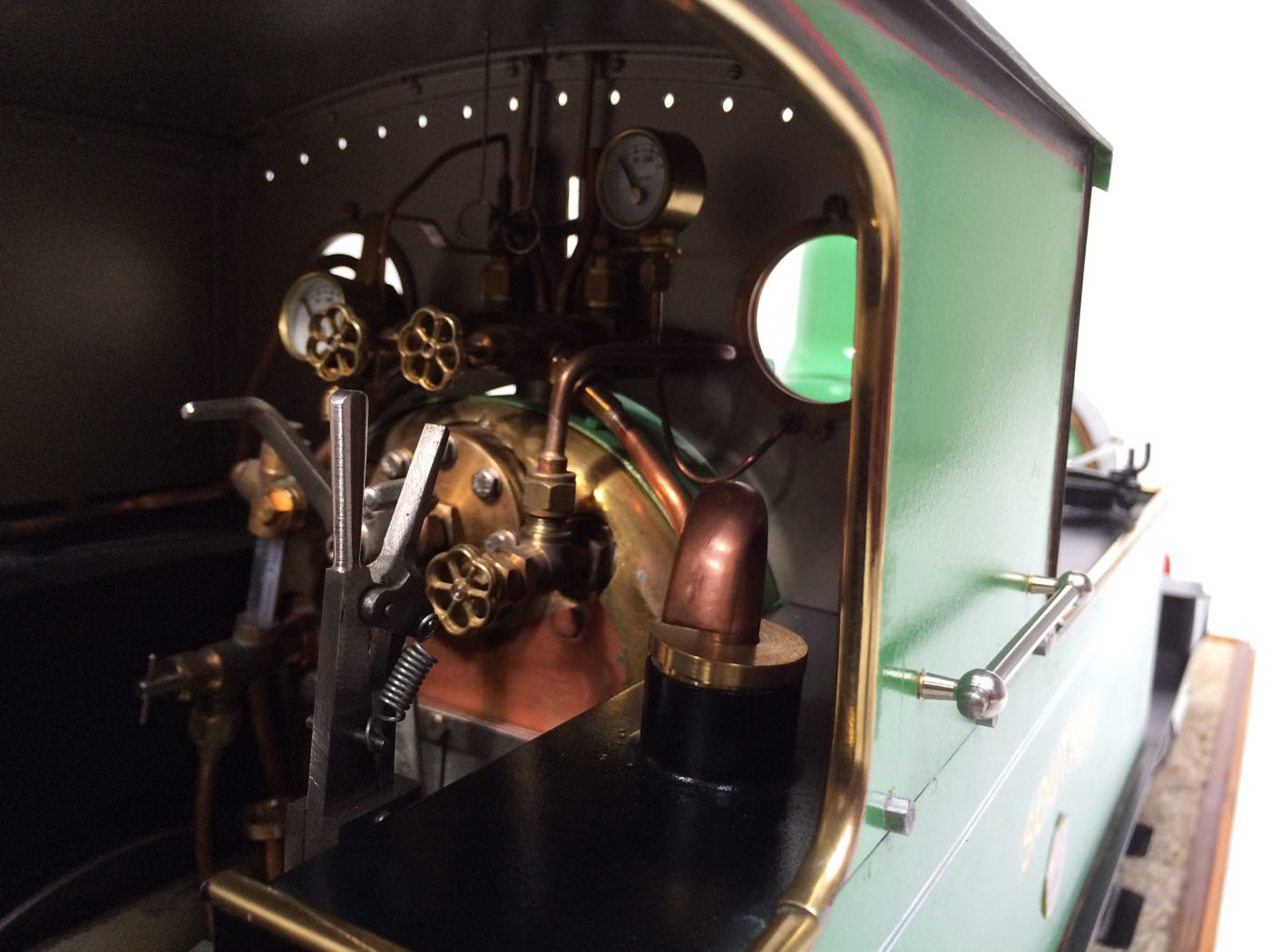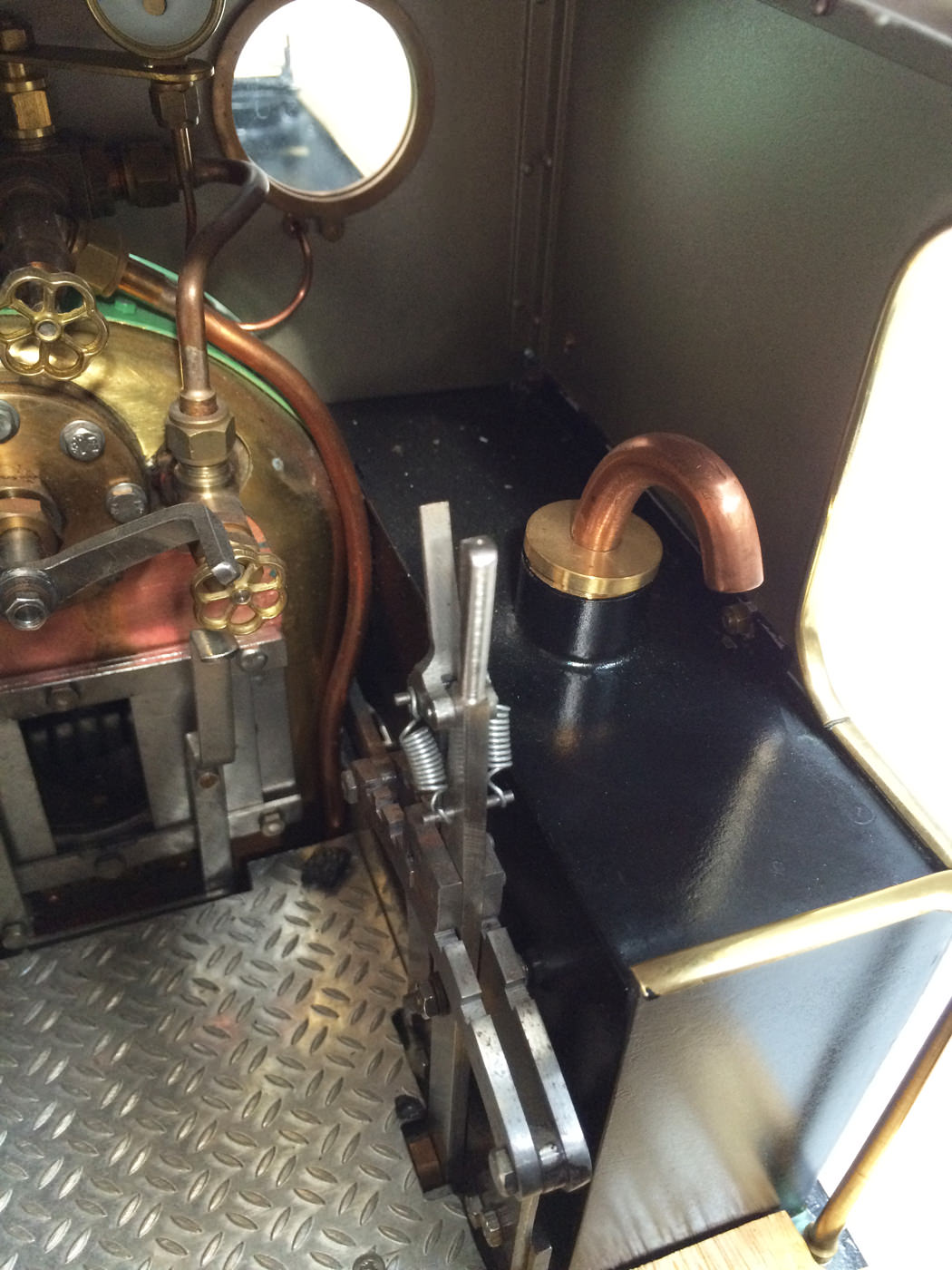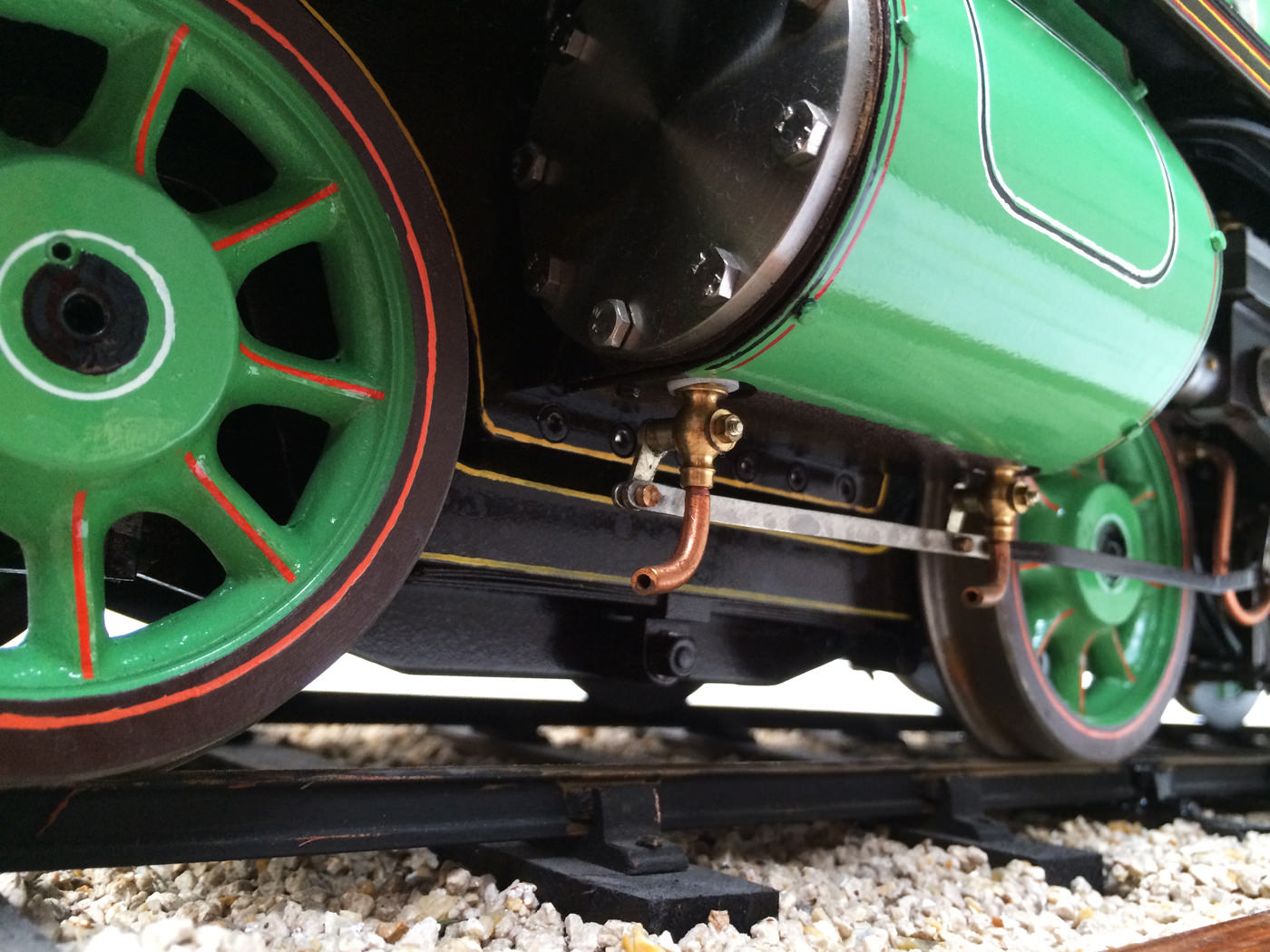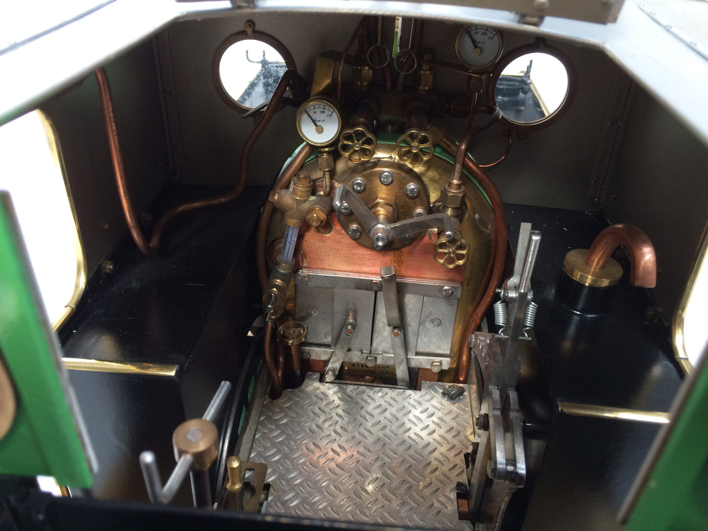 The photos speak for themselves, but in brief, brand new certificated professional Swindon boiler, twin injectors, axle pump with footplate mounted bypass valve and a hand pump on the footplate too.  mechanical lubricator hidden in the front sand box, footplate operated drain cocks,..... everything you could wish for.  The lining is all done very competantly by hand, and it's all nicely new, fresh and ready to play.