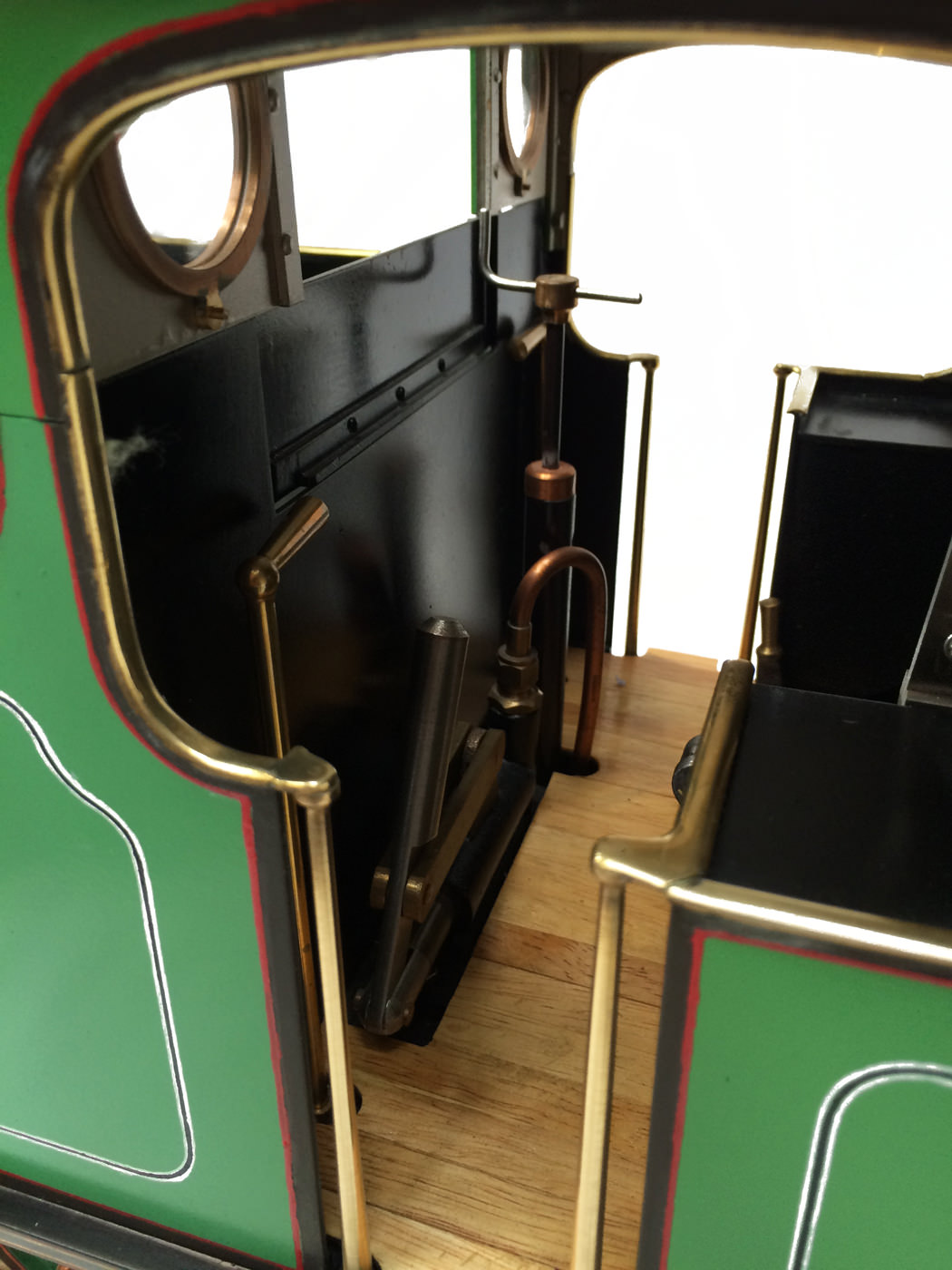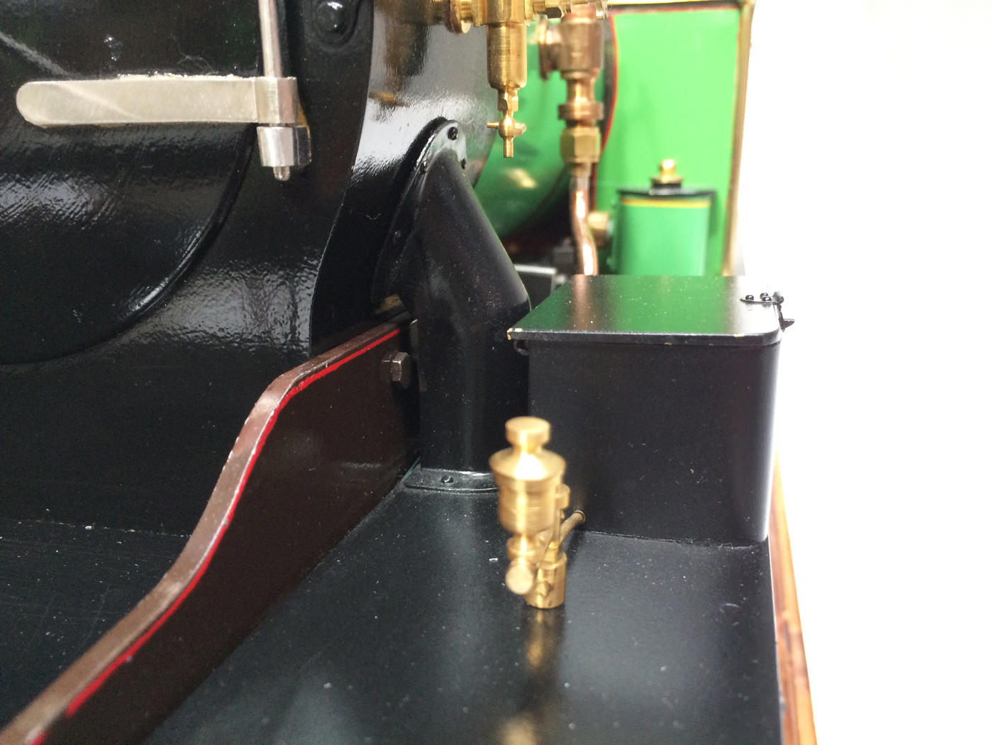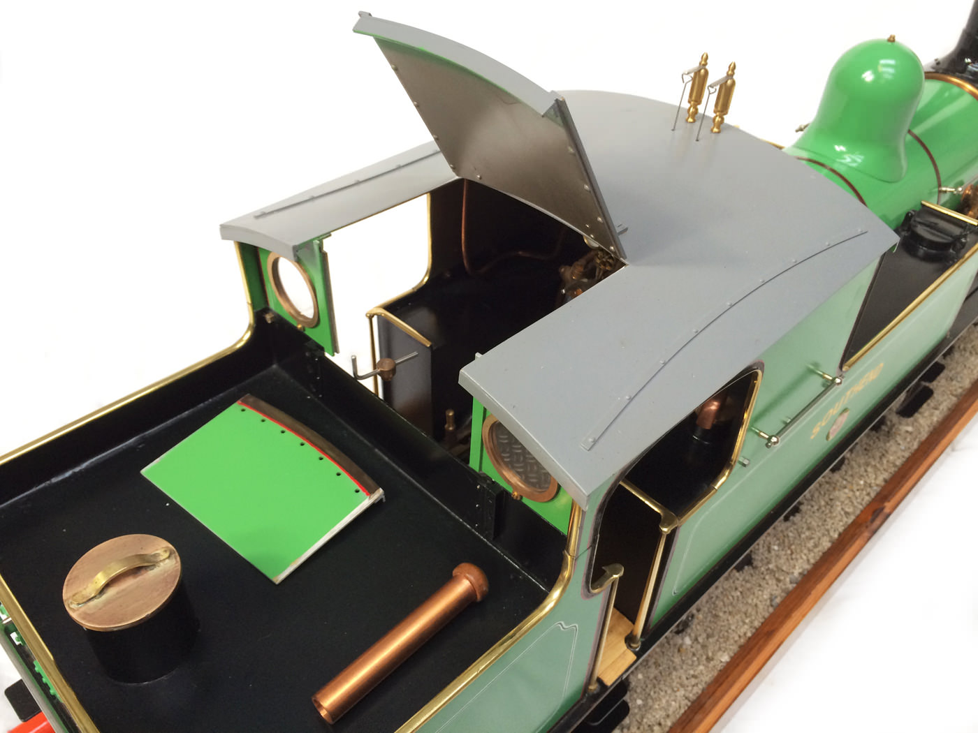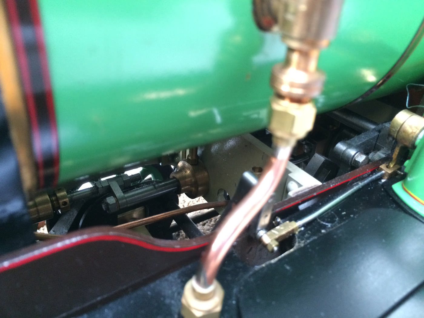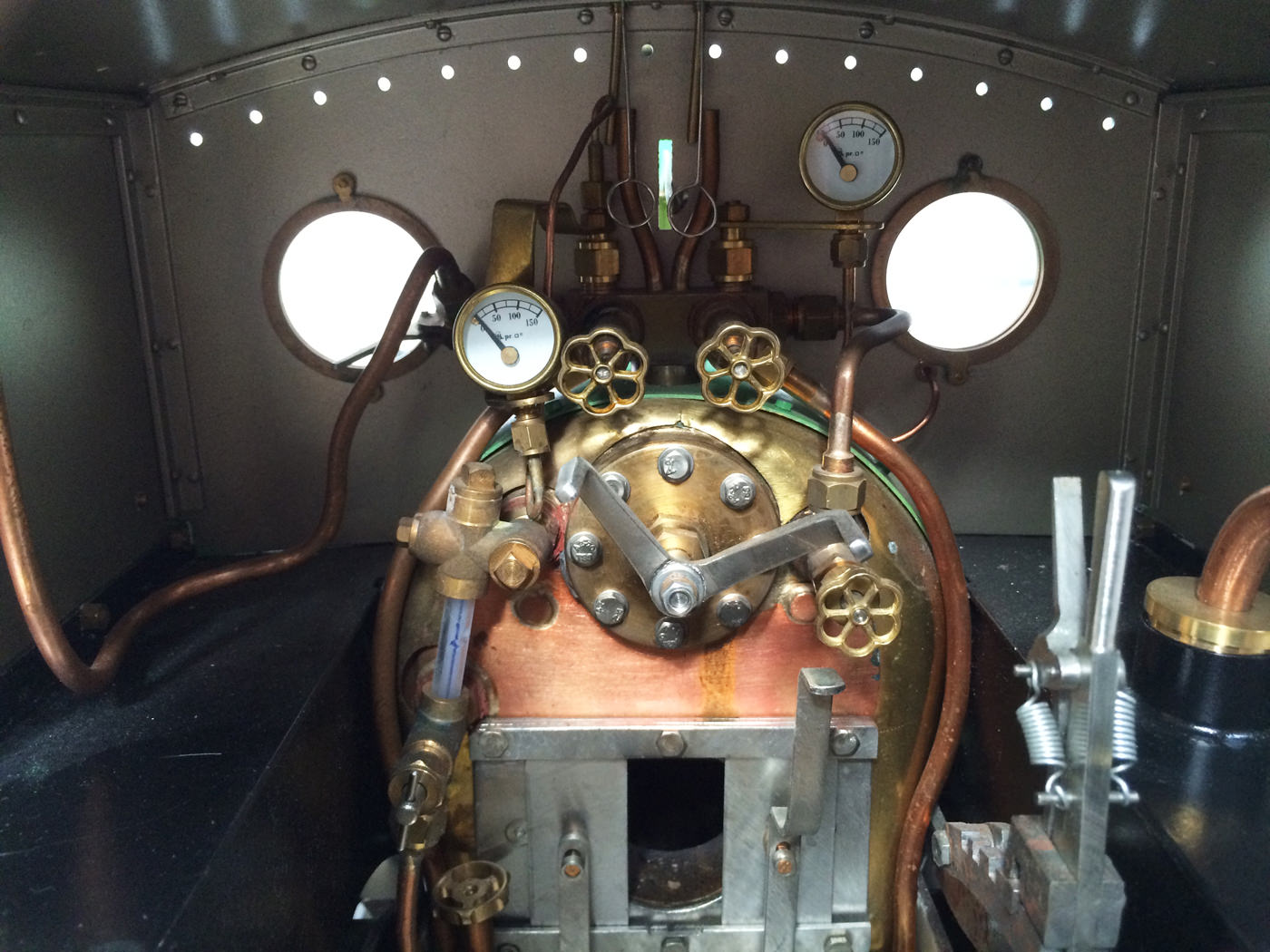 The photos speak for themselves, but in brief, brand new certificated professional Swindon boiler, twin injectors, axle pump with footplate mounted bypass valve and a hand pump on the footplate too.  mechanical lubricator hidden in the front sand box, footplate operated drain cocks,..... everything you could wish for.  The lining is all done very competantly by hand, and it's all nicely new, fresh and ready to play.