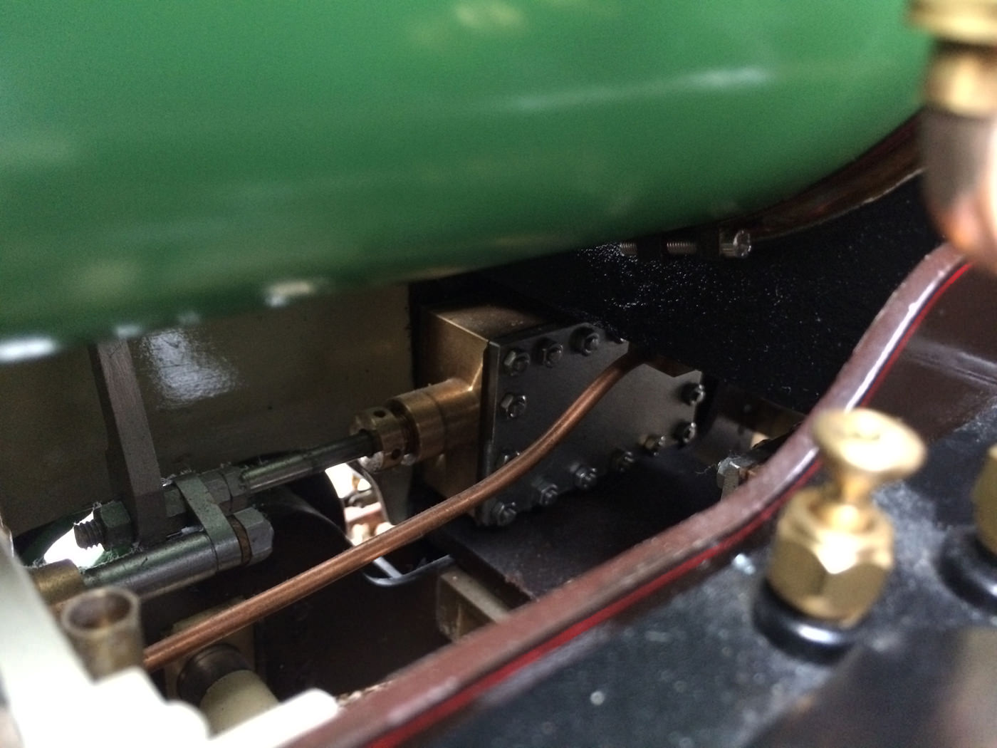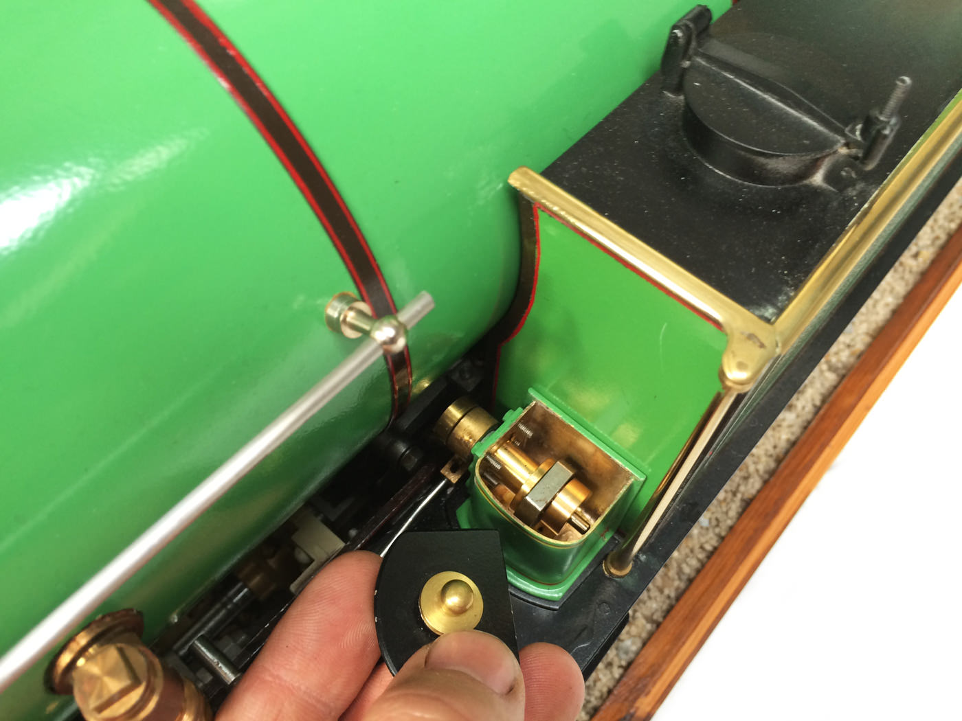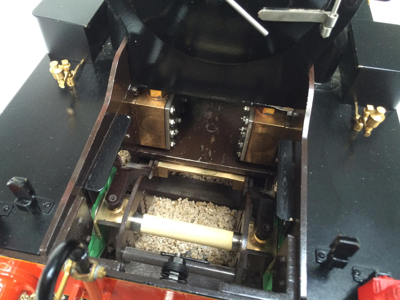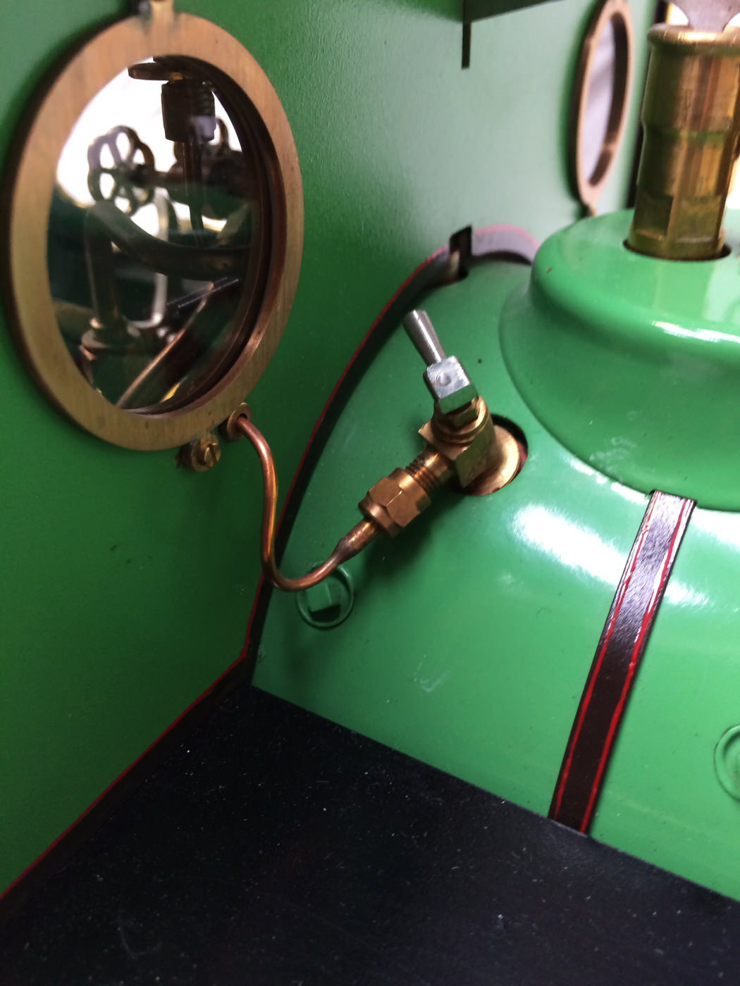 The photos speak for themselves, but in brief, brand new certificated professional Swindon boiler, twin injectors, axle pump with footplate mounted bypass valve and a hand pump on the footplate too.  mechanical lubricator hidden in the front sand box, footplate operated drain cocks,..... everything you could wish for.  The lining is all done very competantly by hand, and it's all nicely new, fresh and ready to play.