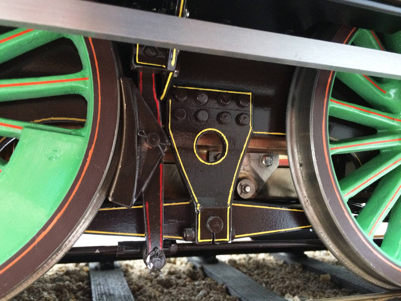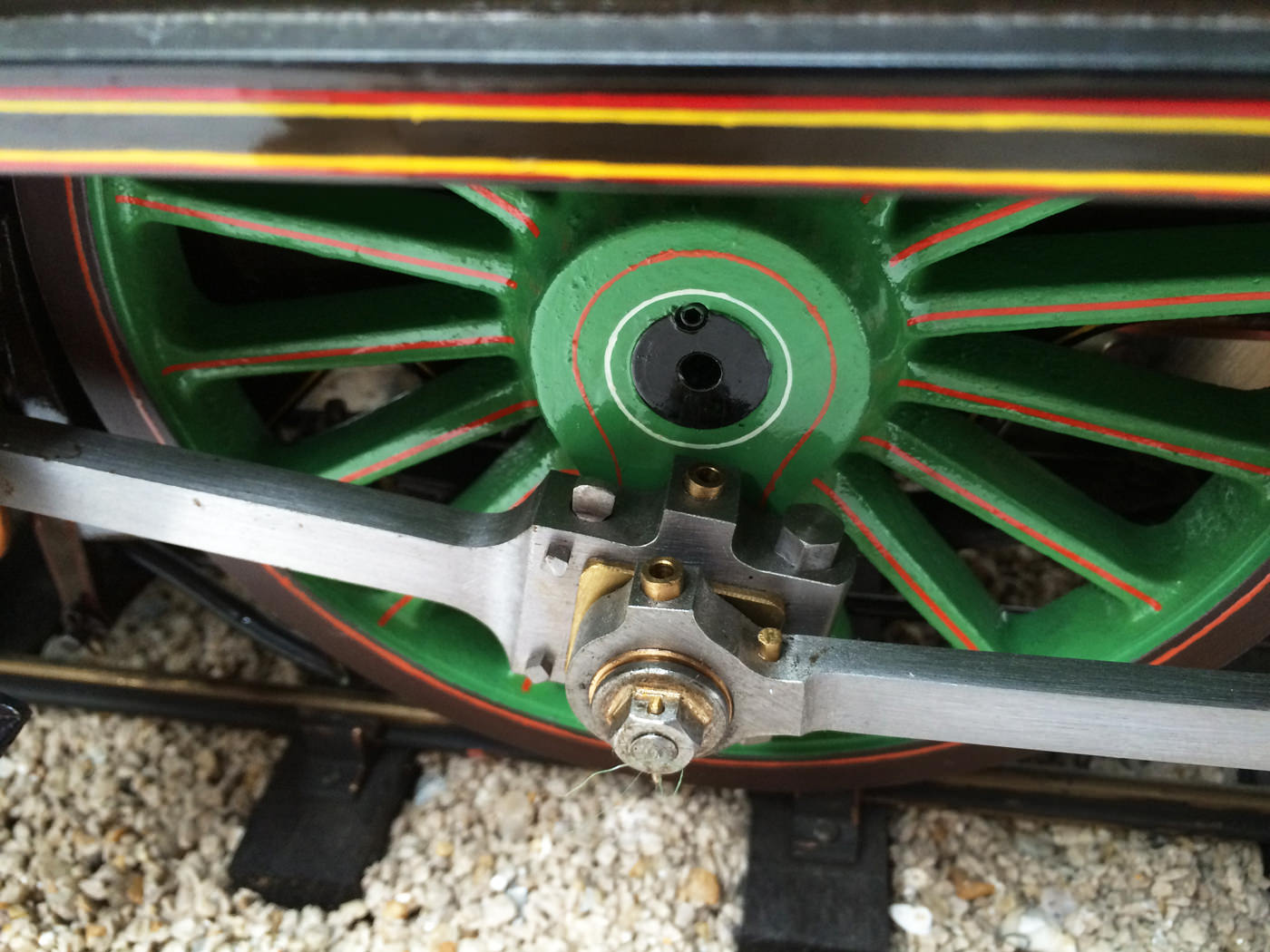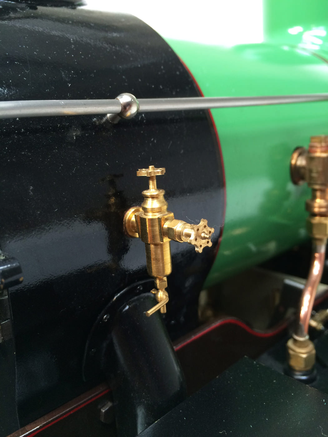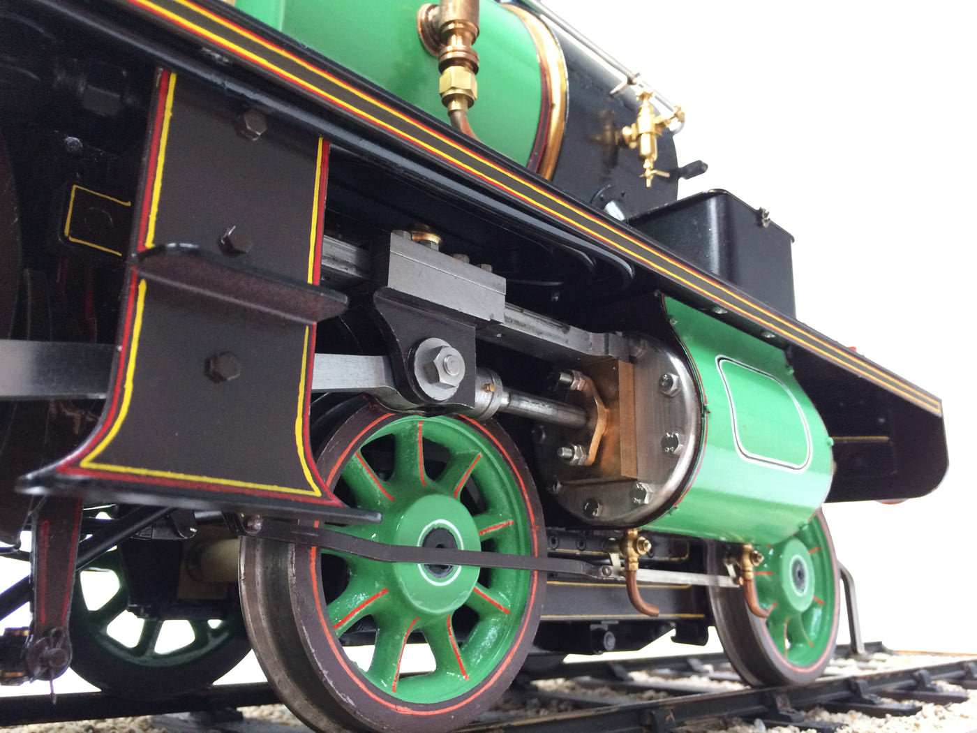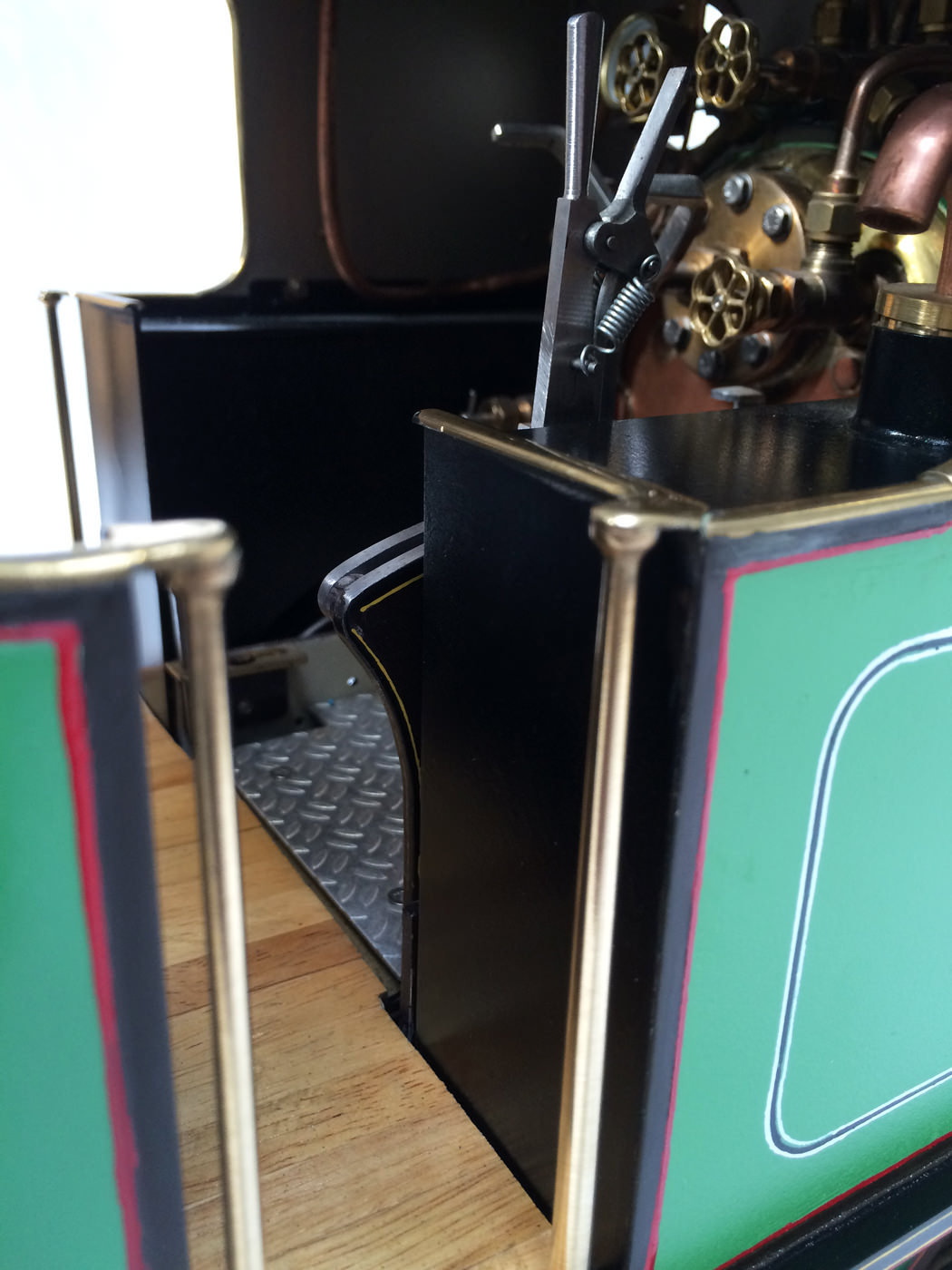 The photos speak for themselves, but in brief, brand new certificated professional Swindon boiler, twin injectors, axle pump with footplate mounted bypass valve and a hand pump on the footplate too.  mechanical lubricator hidden in the front sand box, footplate operated drain cocks,..... everything you could wish for.  The lining is all done very competantly by hand, and it's all nicely new, fresh and ready to play.