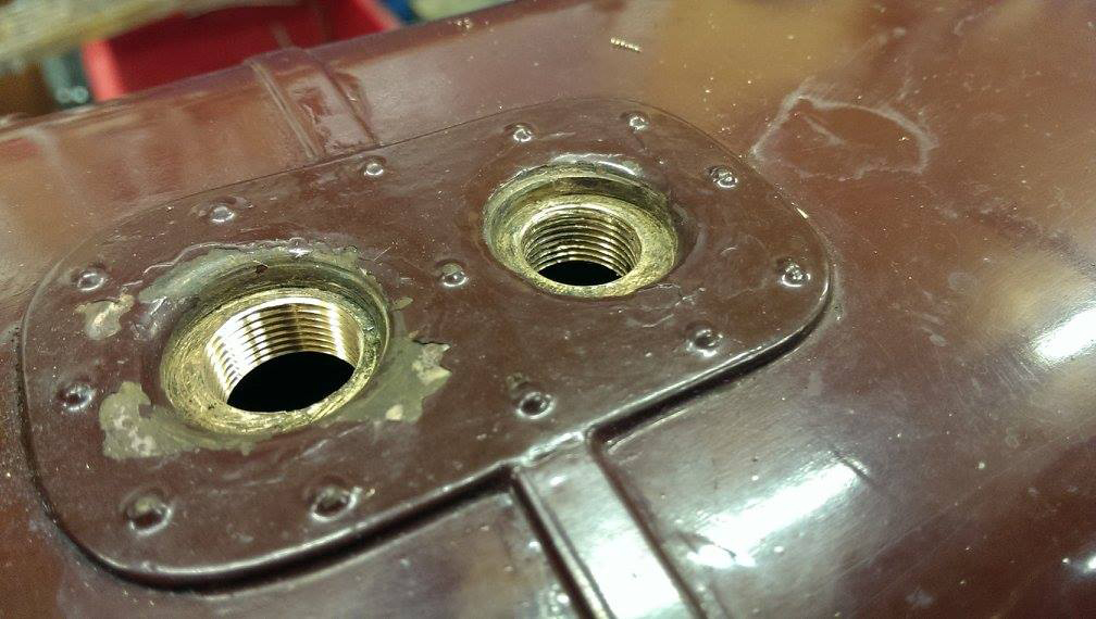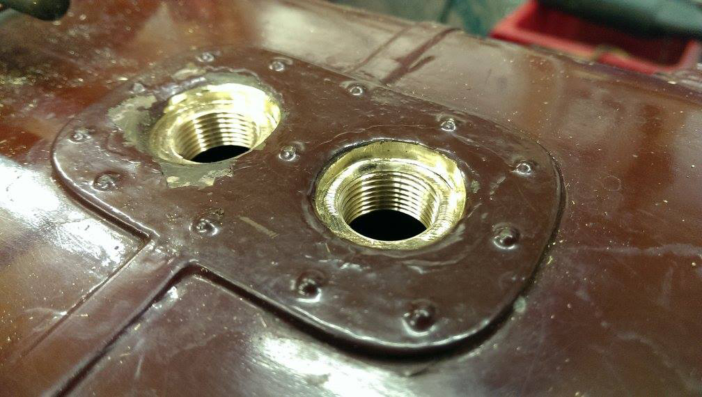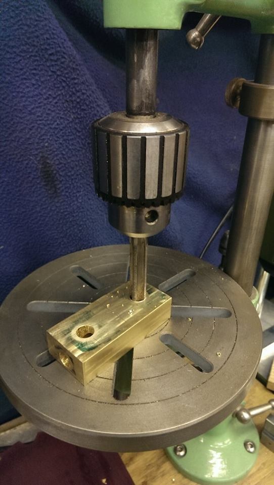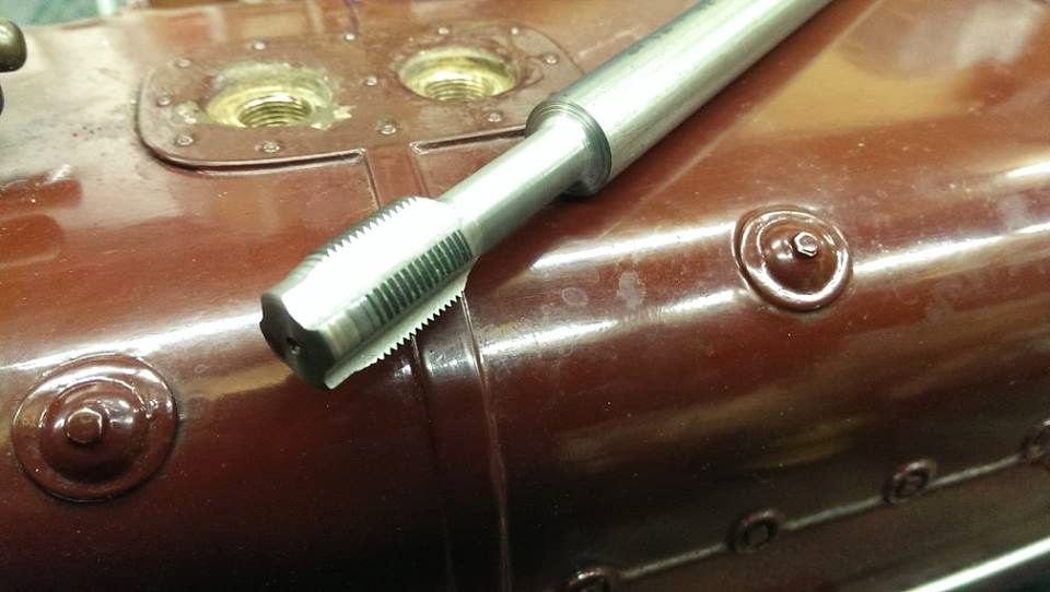 So first up were the safety valves. It was decided to carefully ream out the bushes a little first. There wasn't an enormous amount of metal left so care was taken not to open them out too far. John then bespoke made a new tap to do the job to fit the new size of the whole, (19/32 x 26tpi), and the bushes were tapped back to a satisfactory thread.