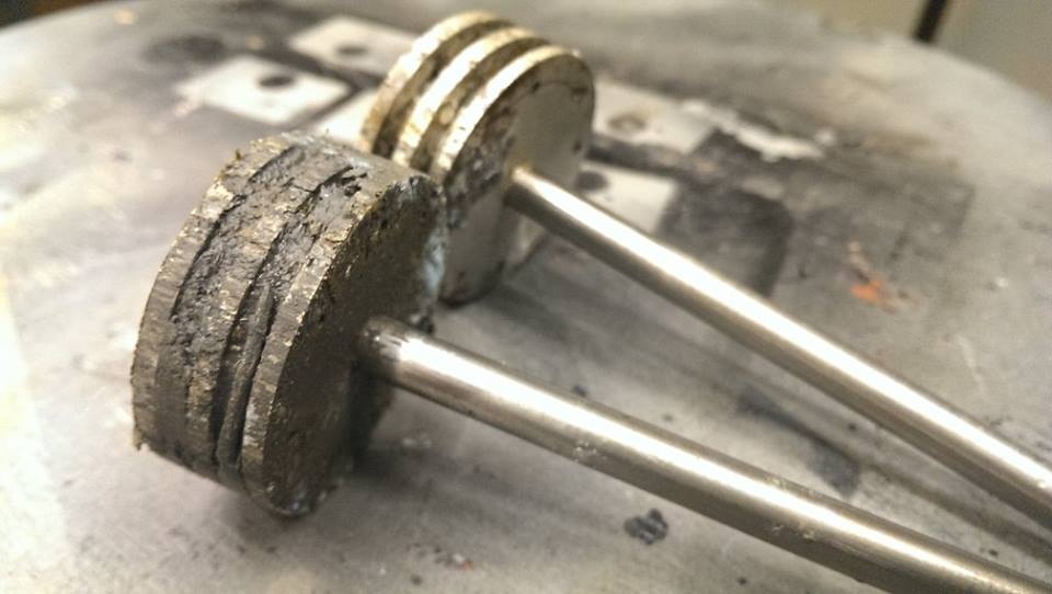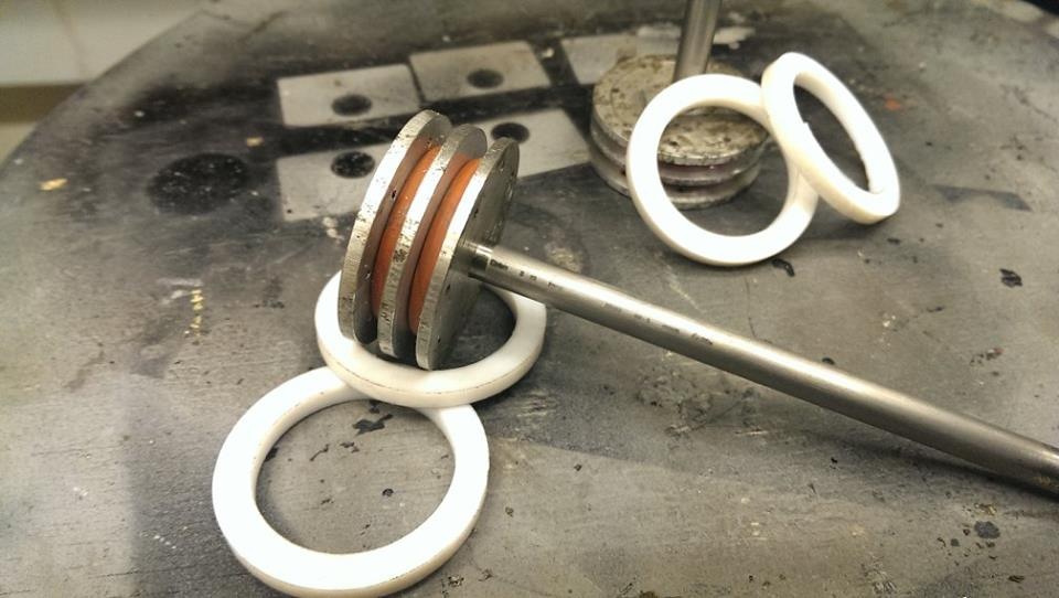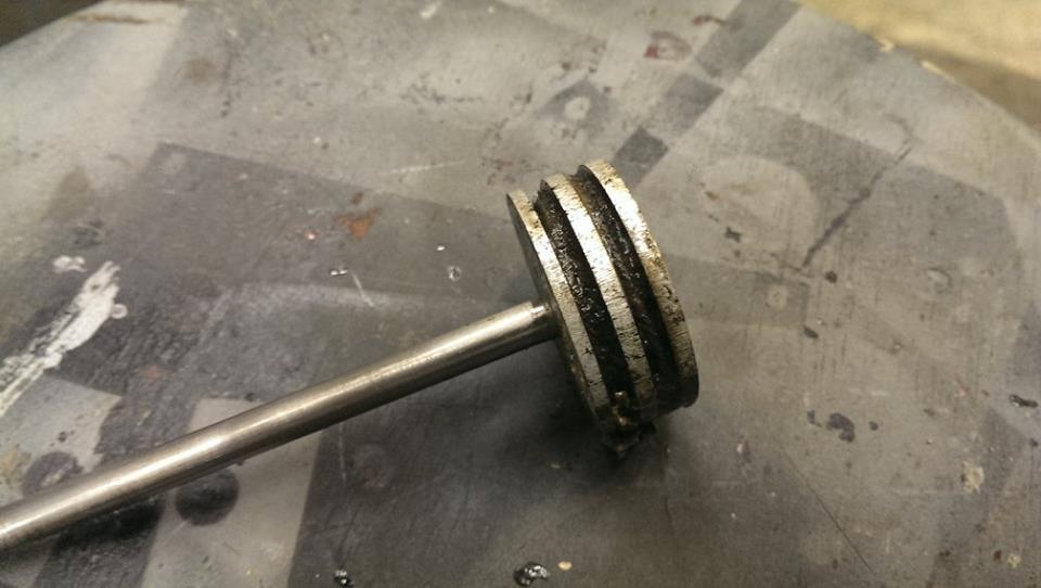 Next up are the cylinders. The intention is to sort out the rings and packing. The loco was blowing past fairly badly when test run, so we will probably re-machine the pistons to be fitted with specially made PTFE rings, as with the right tolerances we've found these to work really well. There's no risk of cracking as might be an issue with traditional cast iron, and the longevity of PTFE is excellent. The pictures showthe pistons as they were removed from the model, with lots of very mucky and degraded packing material, ad the re-machined pistons, orange o-rings in the ring slots, and the PTFE rings ready to go in.