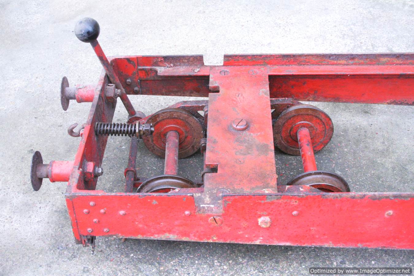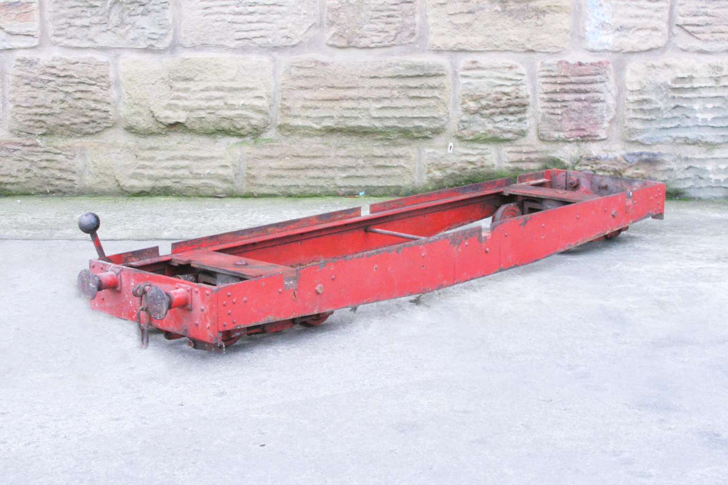 Here we have a 5" Gauge Riding truck. Missing a body, so in need of someone with basic woodworking skills to make up whatever you fancy to sit on. The frame is nicely made and substantial though, and the bogies are of equally robust build. It rides very nicely, and has brakes to the front bogie. Fitted with nicely made sprung buffers, this has all the hard work done for a nicely stable and usable riding truck. Another one that would be transformed with a lick of paint!