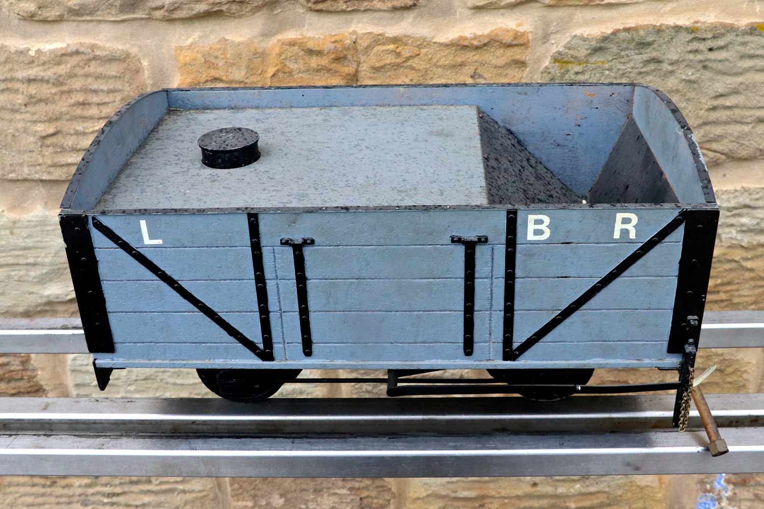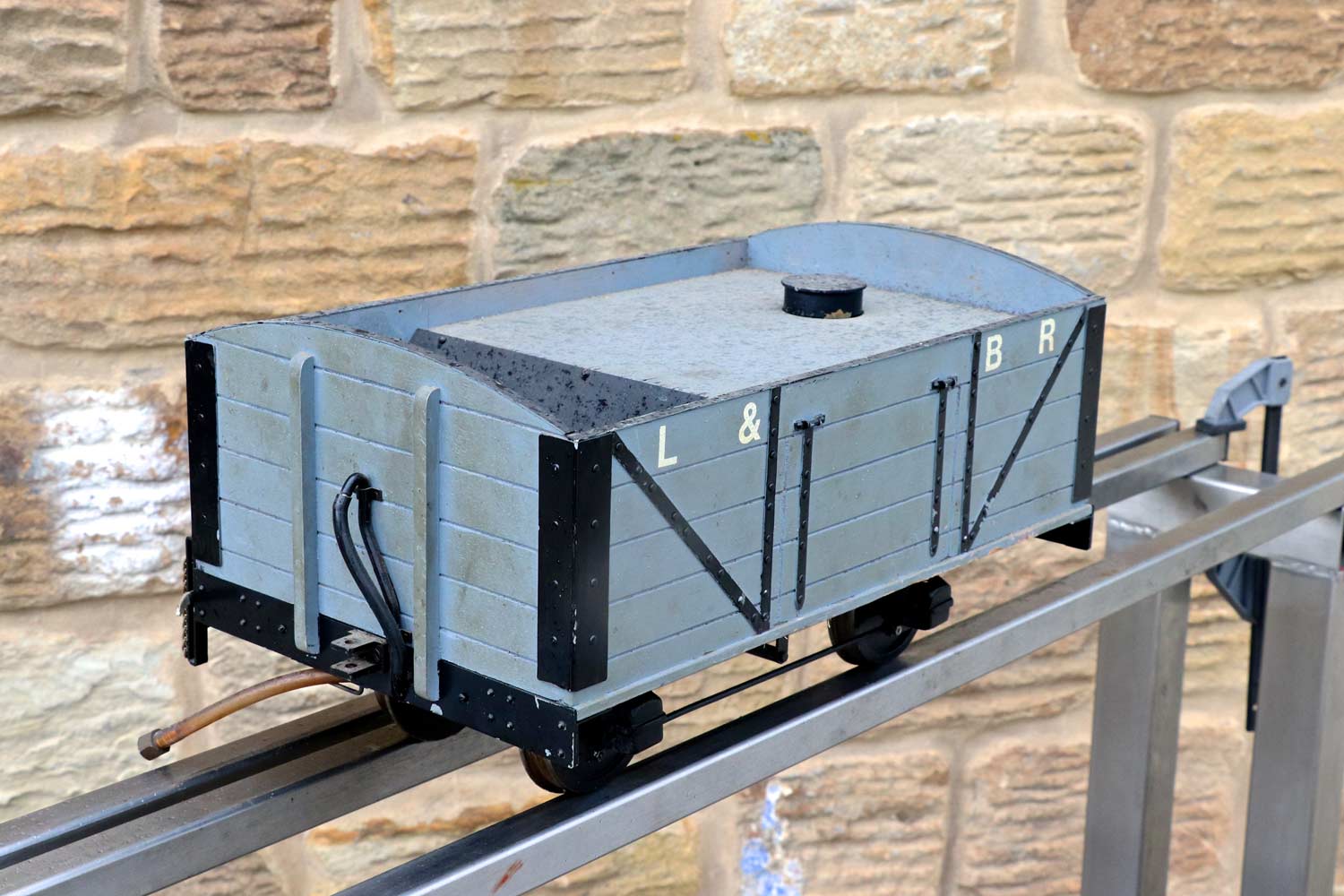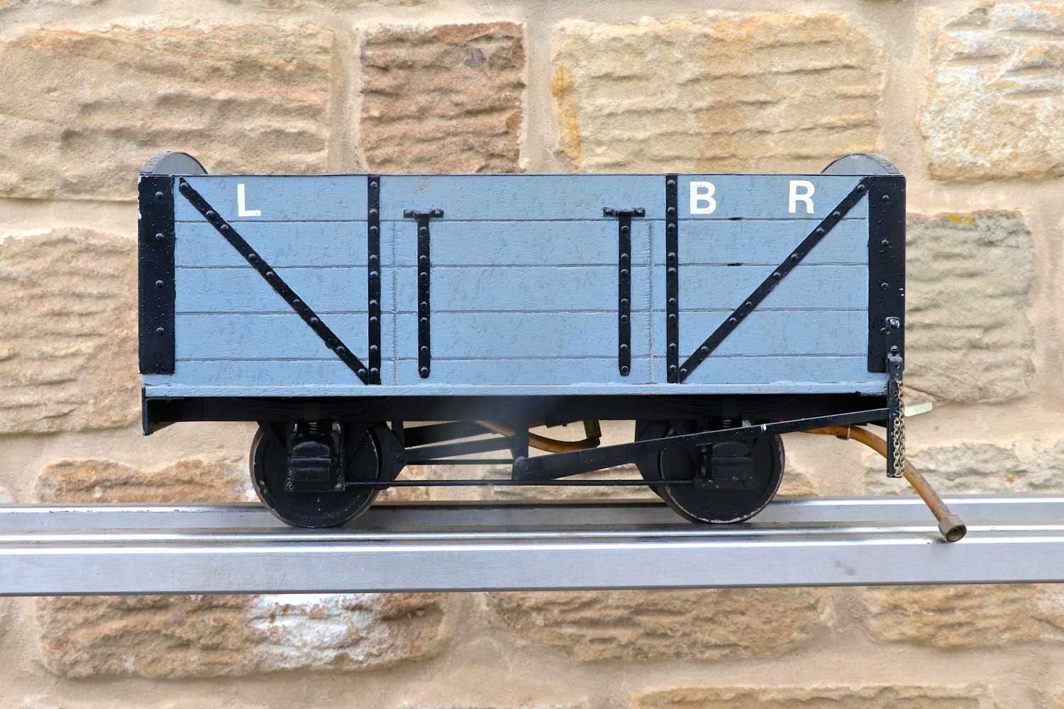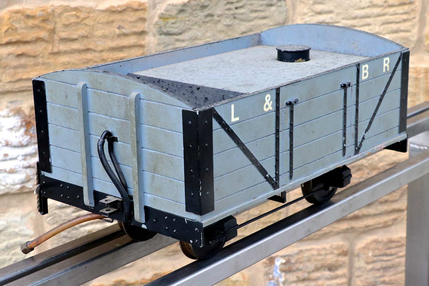 Here we have a rather lovely little 3 1/2" gauge Lynton & Barnstaple driving truck. It's got a water tank with filler cap, and a coal space up front. There is nice brake gear detailing on the chassis and even the vac brake pipes are very attractively done. The L&B lettering could easily be removed if you've some other prototype, but it's definitely a wagon with a lot of character and ideal to sit as a tender for your 3 1/2" narrow gauge tank engine.