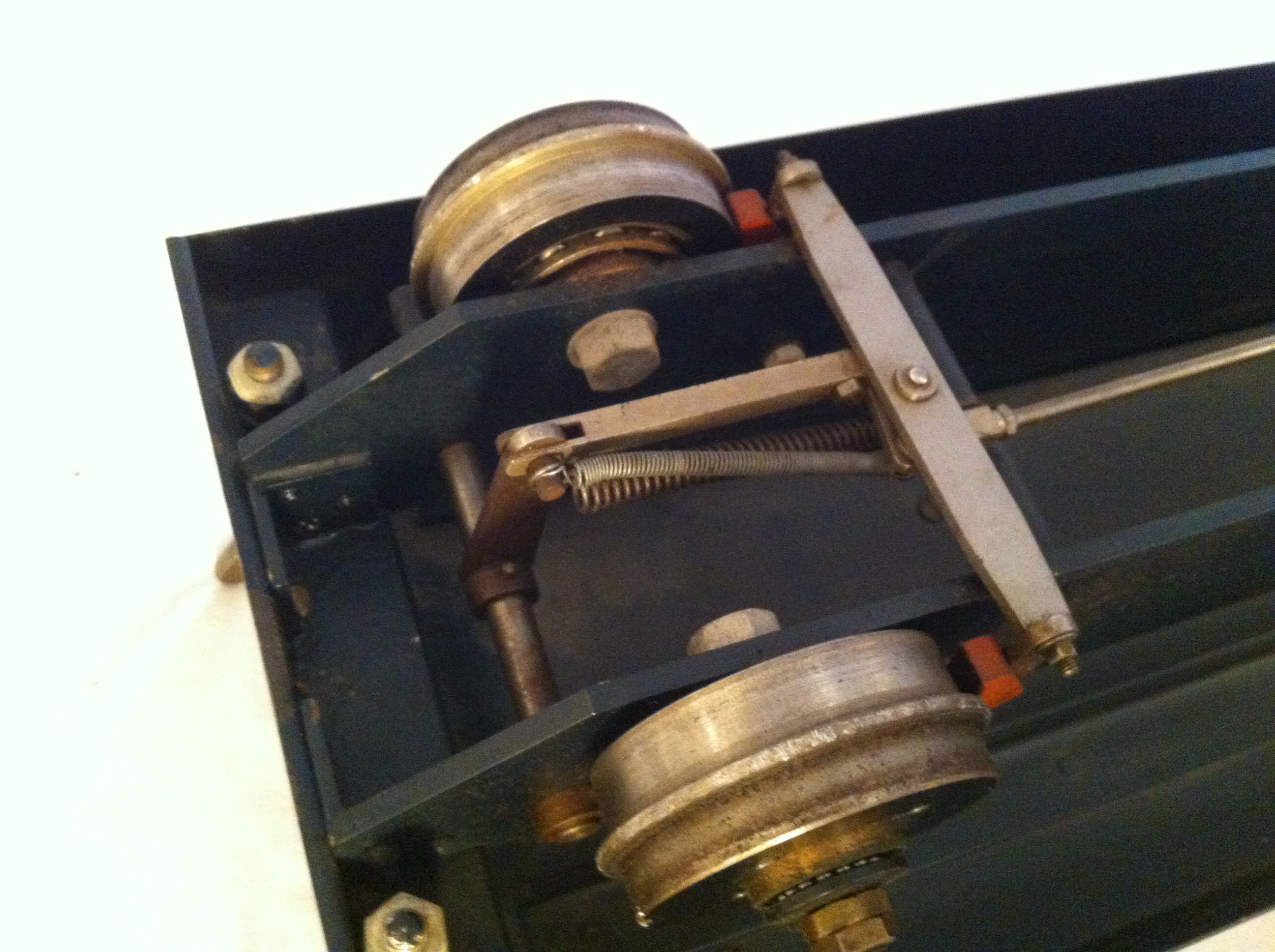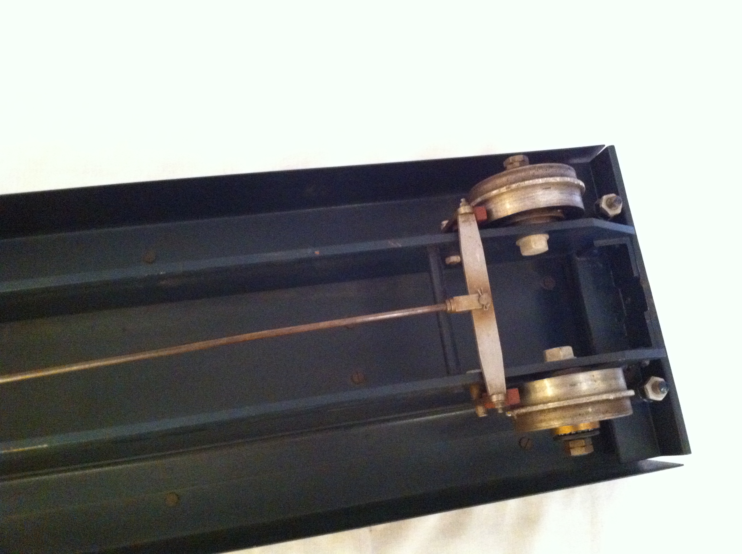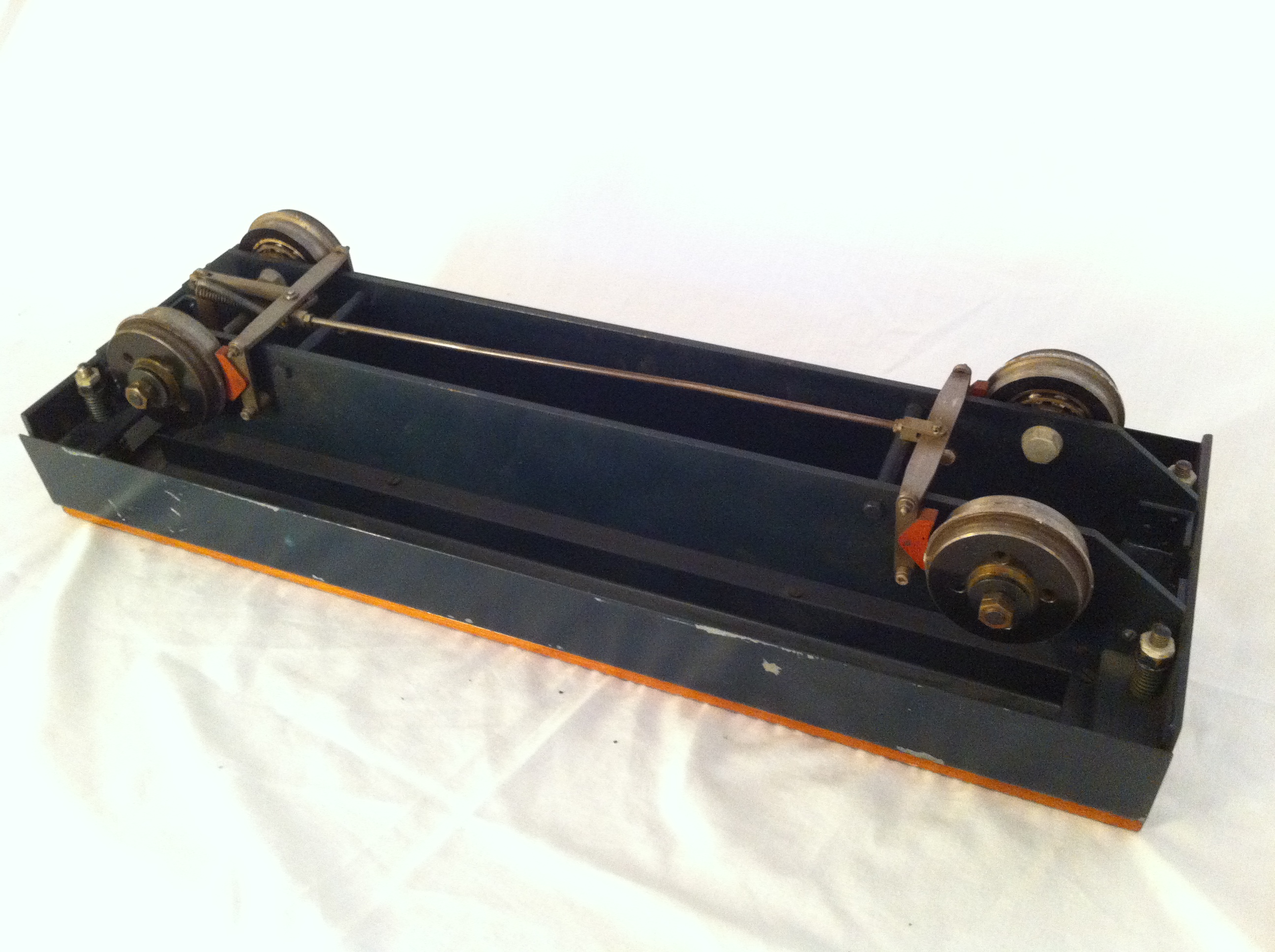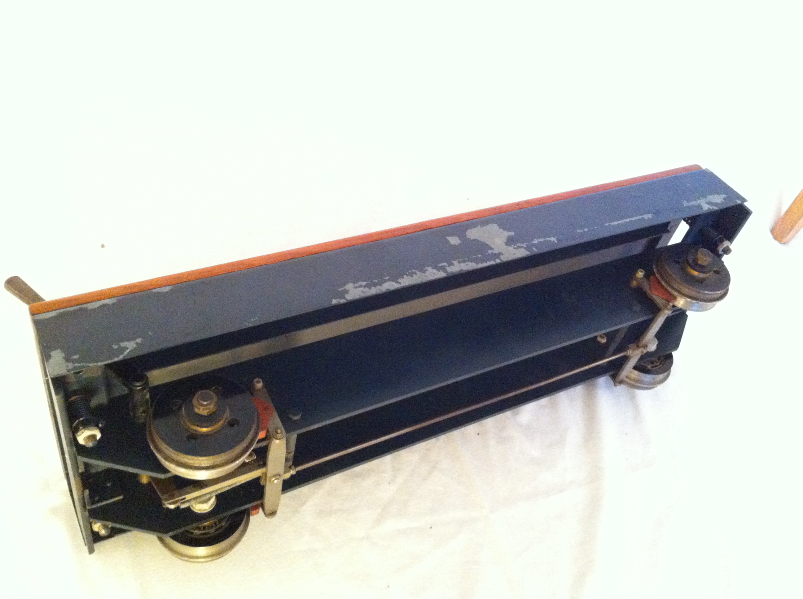 It's been designed I think (because of it's shallowness) to run on a raised track. Although not a brand new item, it is basically unused, and as you can see it doesn't have footsteps fitted yet for either raised or ground level running. A strongly built and well thought out little truck, ready for rigging up according to your track needs.