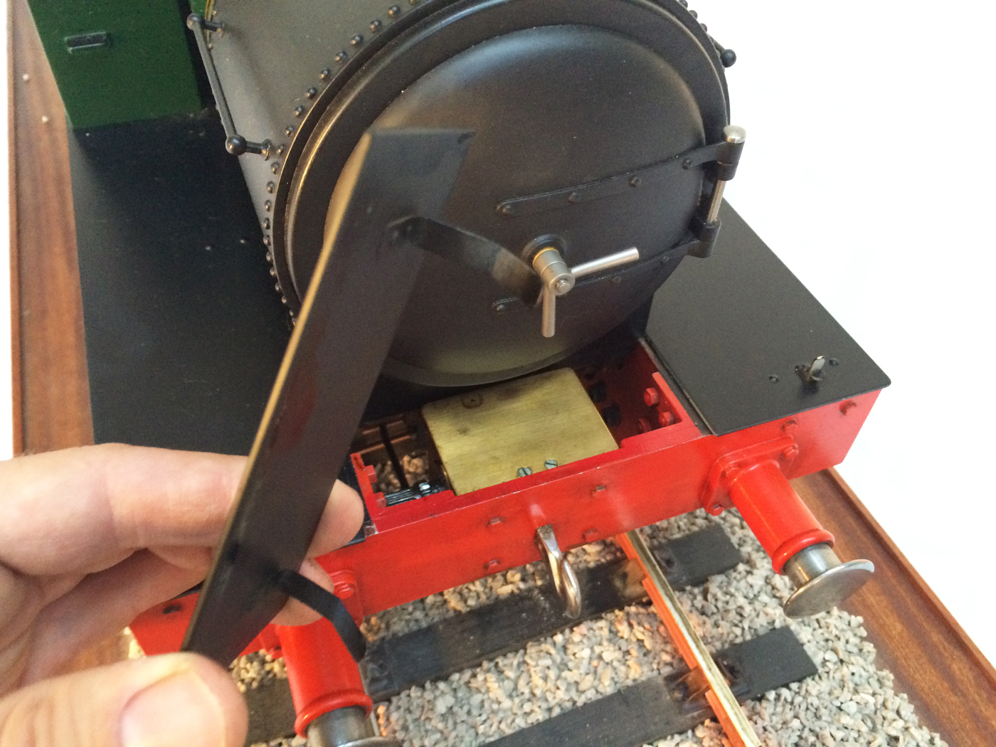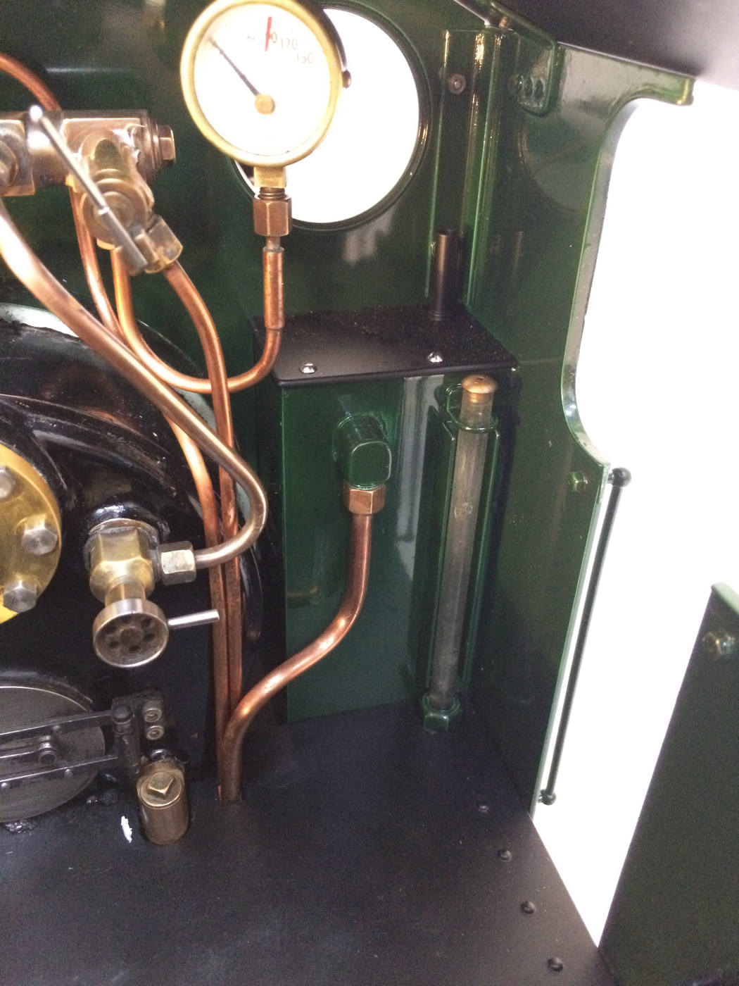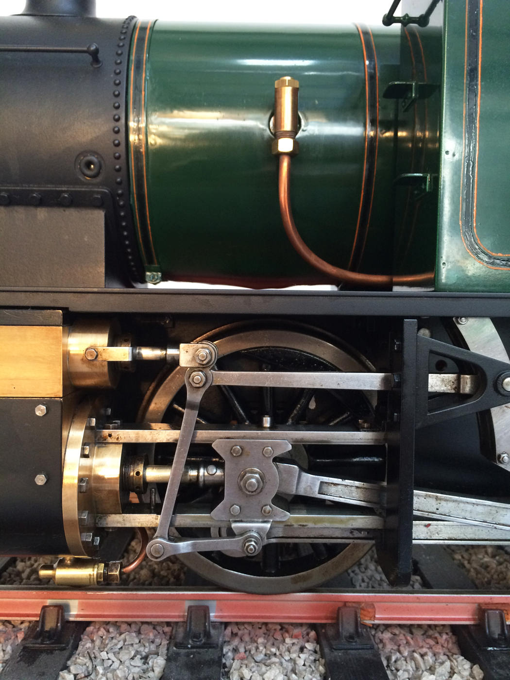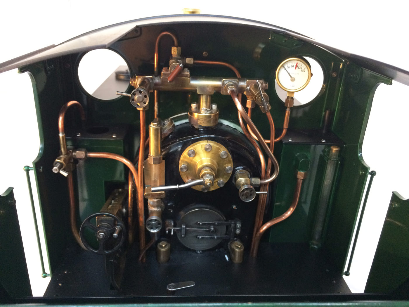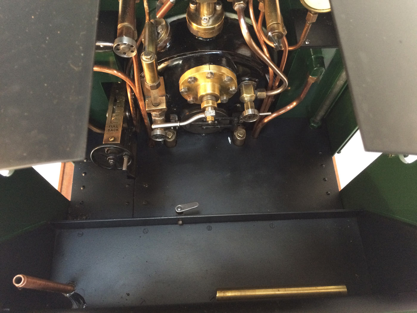 All the usual bits and bobs are there, injector, axle pump, tank hand pump.  Mechanical lubrication is from the big tank hidden under the front footplate.  As well as the bits you'd hope for there are a few other nice touches like a tank water gauge, easy to remove tank tops to gain access to the hand pump and filler filters.  Compression is superb, (you can pump up the boiler by sticking it in forwards and pulling it along in reverse).  It's a silver soldered copper boiler of course, and comes fully tested and certificated ready to play.  It's a really clean, mechanically sorted Simplex, one of the best that you're likely to find.