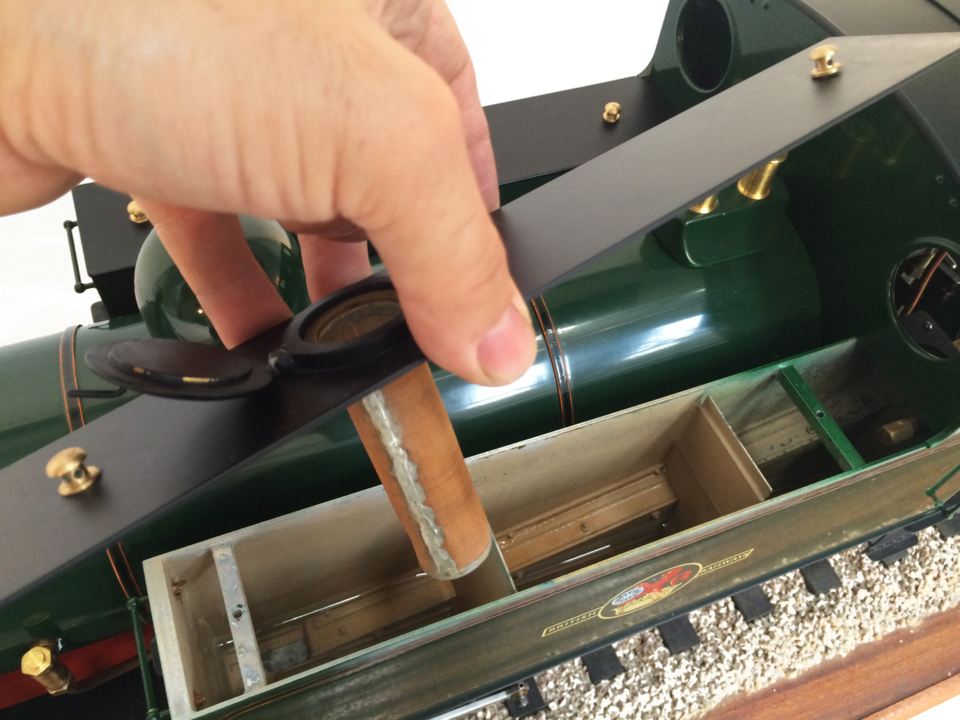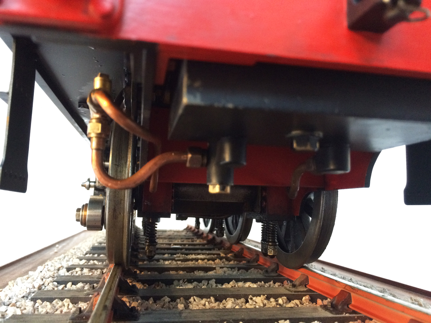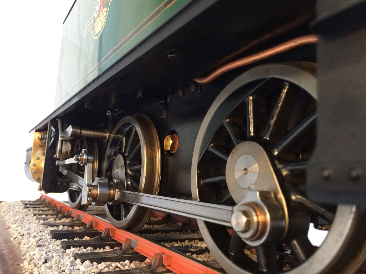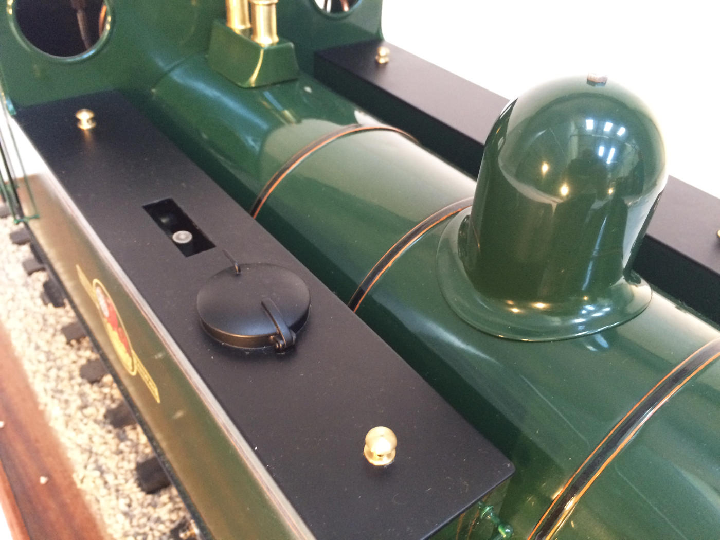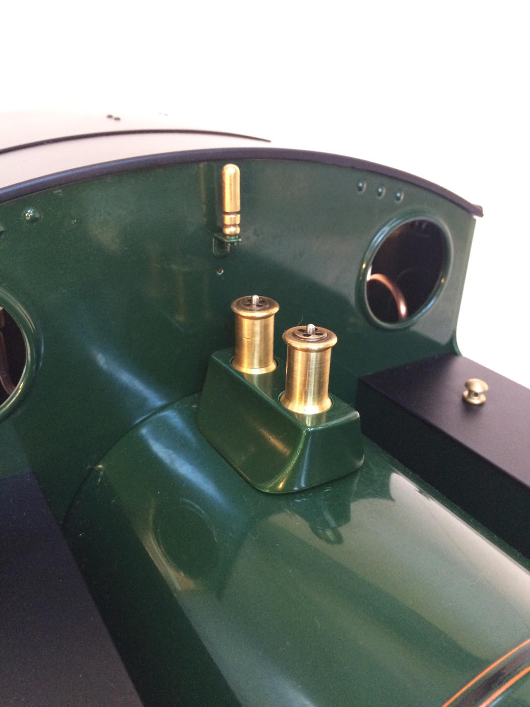All the usual bits and bobs are there, injector, axle pump, tank hand pump.  Mechanical lubrication is from the big tank hidden under the front footplate.  As well as the bits you'd hope for there are a few other nice touches like a tank water gauge, easy to remove tank tops to gain access to the hand pump and filler filters.  Compression is superb, (you can pump up the boiler by sticking it in forwards and pulling it along in reverse).  It's a silver soldered copper boiler of course, and comes fully tested and certificated ready to play.  It's a really clean, mechanically sorted Simplex, one of the best that you're likely to find.