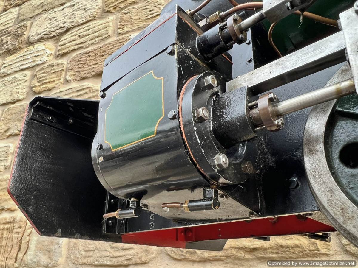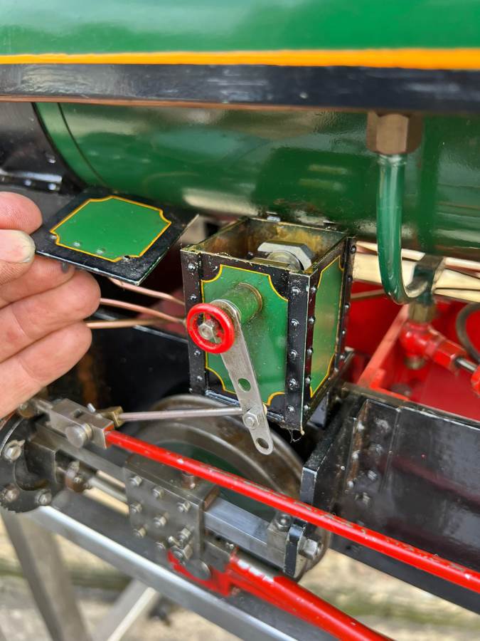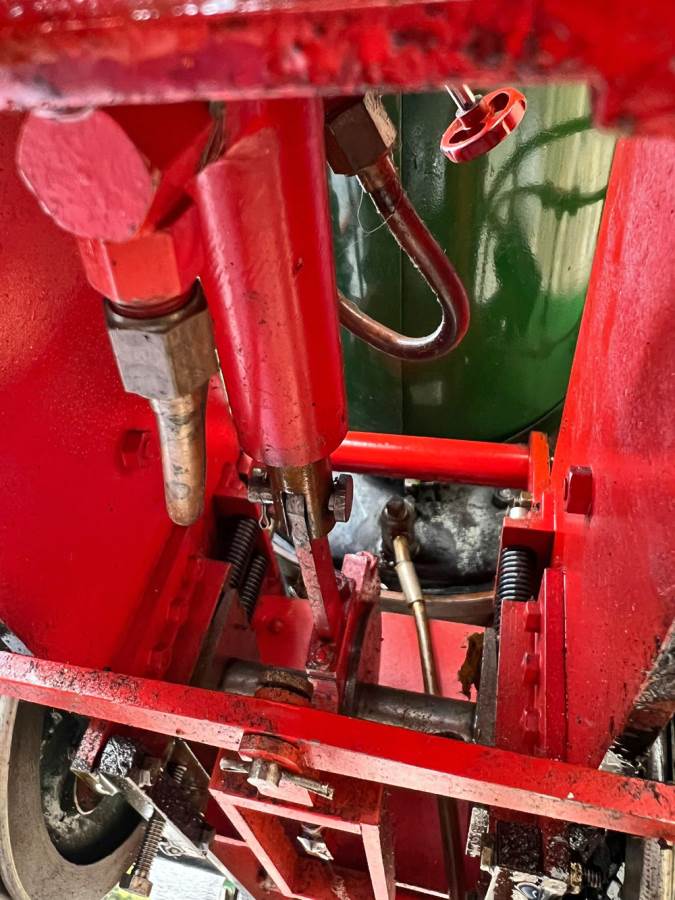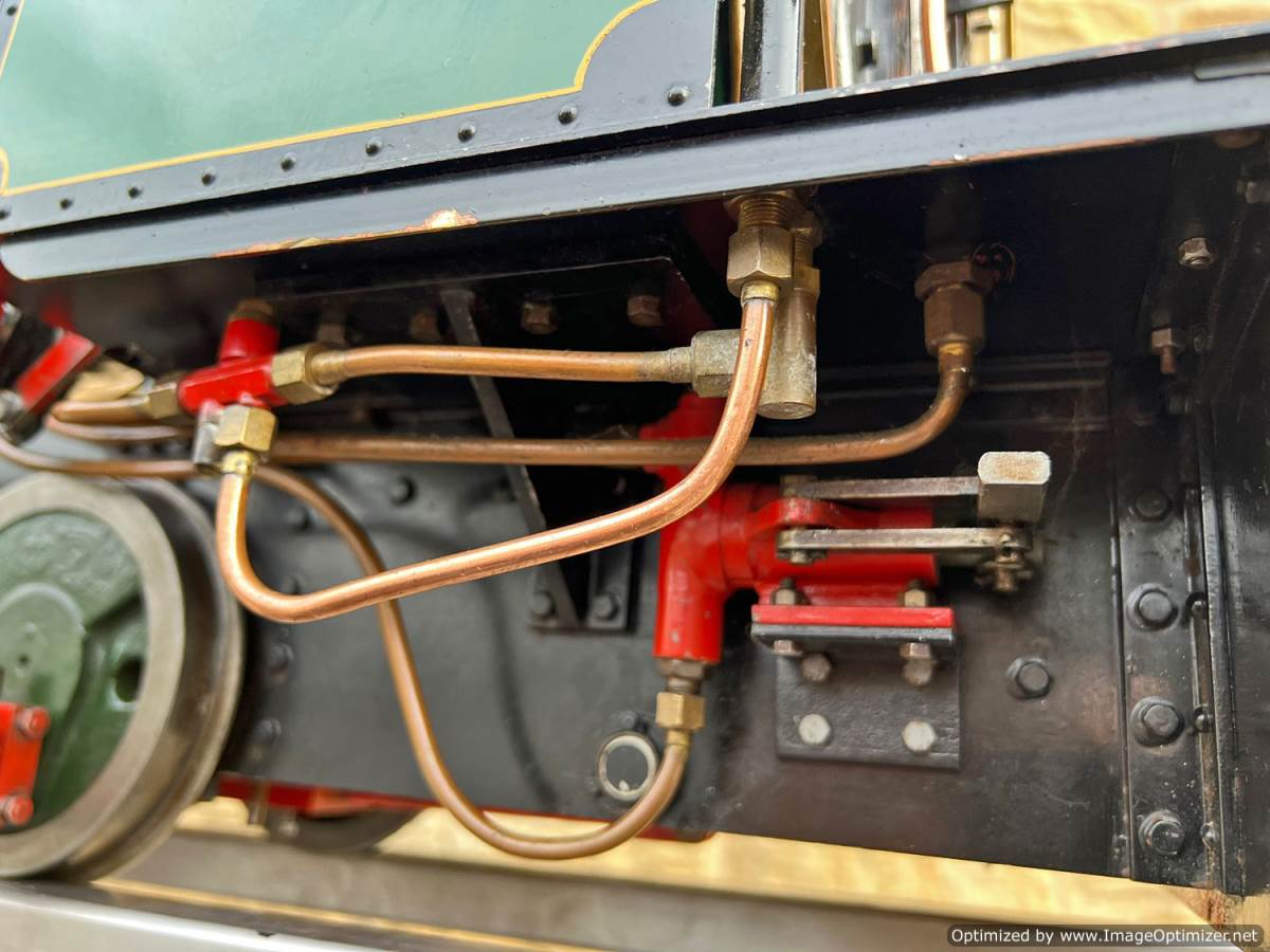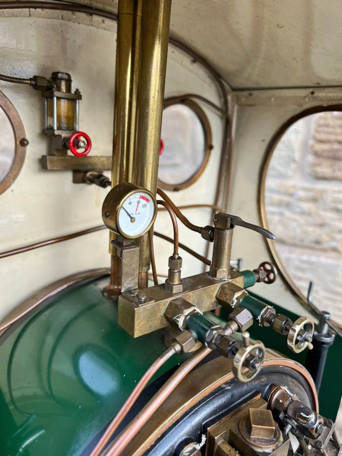 Fitted with an injector, an axle pump with footplate mounted bypass valve as well as a hand pump tucked away under the running board. Lubrication is both mechanical and displacement, so you can chose which you prefer! The mechanical is fed from a nicely made reservoir on the left hand side, and the displacement is fed from a cylinder under the footplate. The displacement splits the feed through two sight feeds in the cab so that you can regulate the supply to each cylinder independently. There's also a rose bud grate currently fitted.