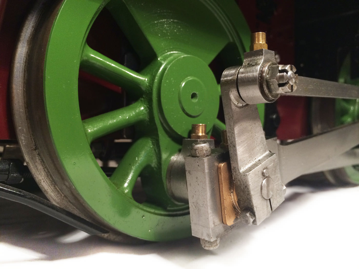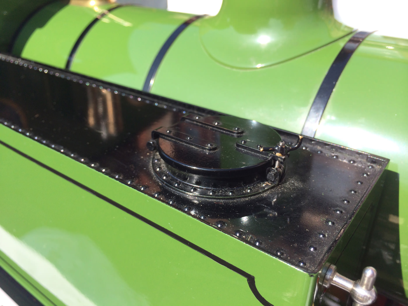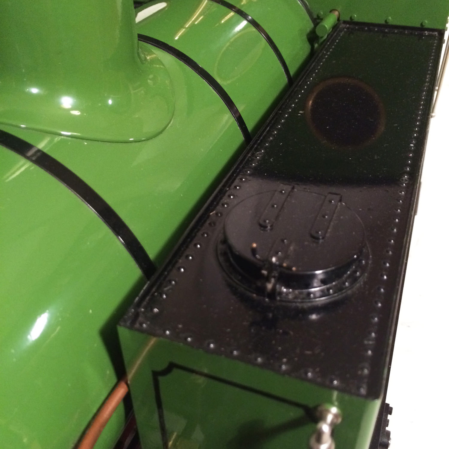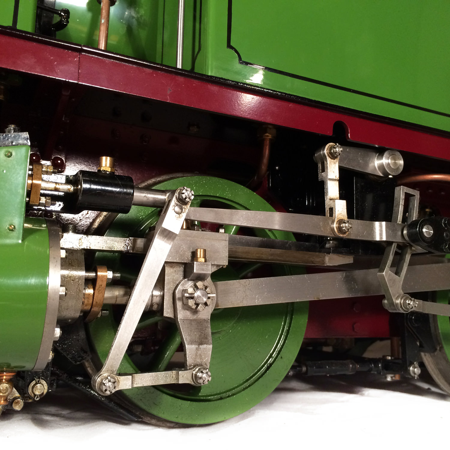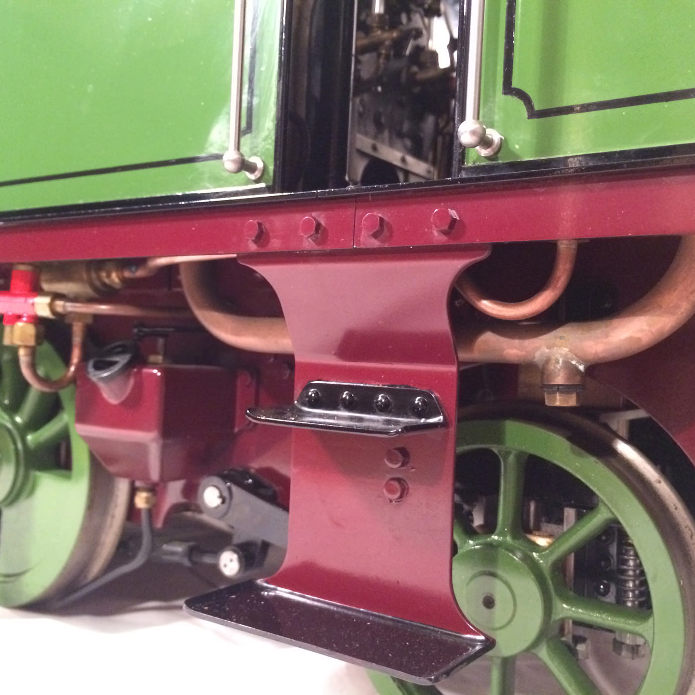 She was built by the late Mr. Fred Lee, a very skilled model engineer to the well proven design by Ken Swan. The boiler is obviously copper and silver soldered, and is fitted with all the usual things you'd like to see. Twin water gauge glasses, pressure gauges, (vacuum and steam) injector, and cab operated cylinder drain cocks.