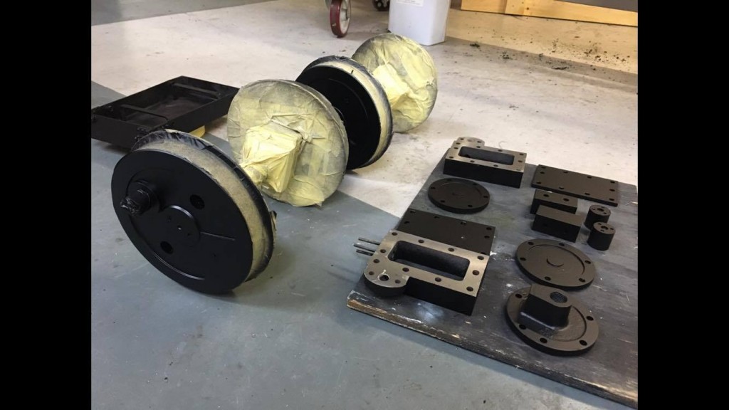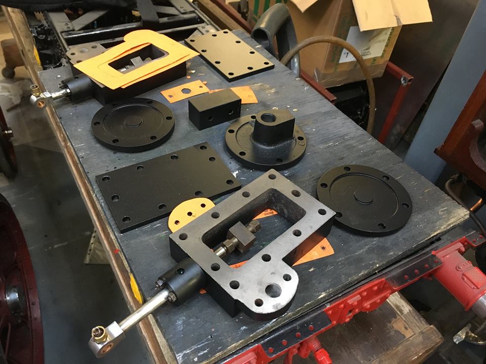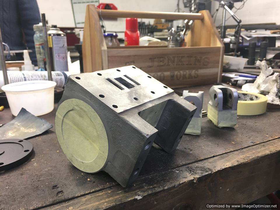 And then everything is bead blasted, before re-painting of the big bits, re-finishing of the motion parts, and re-busing of everything that moves! Cylinders re-bored and re-machined. New pistons, new piston rods and brand new cast iron rings.