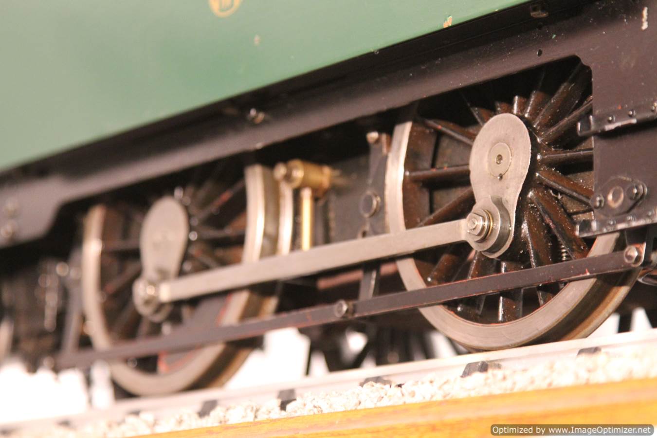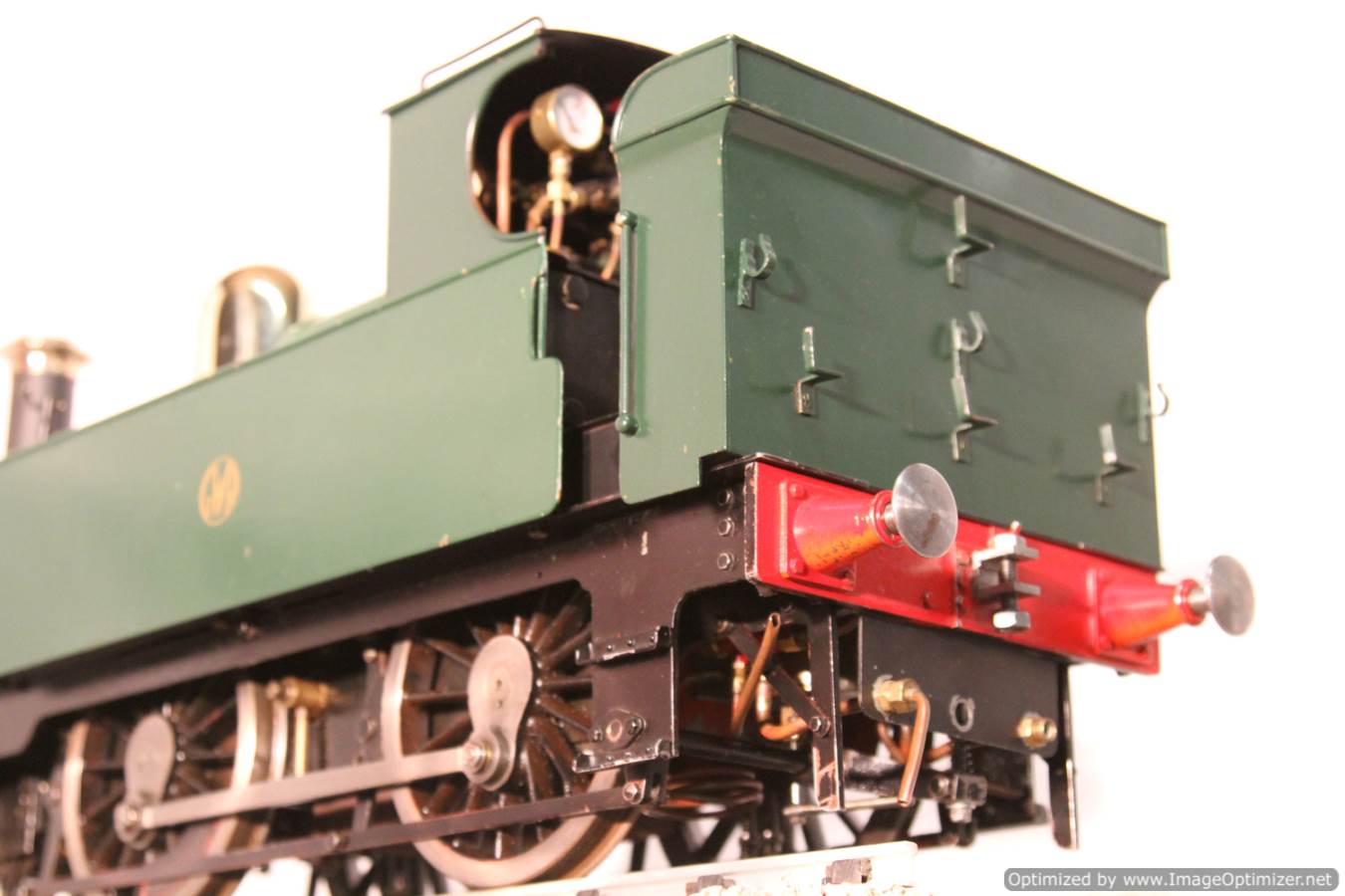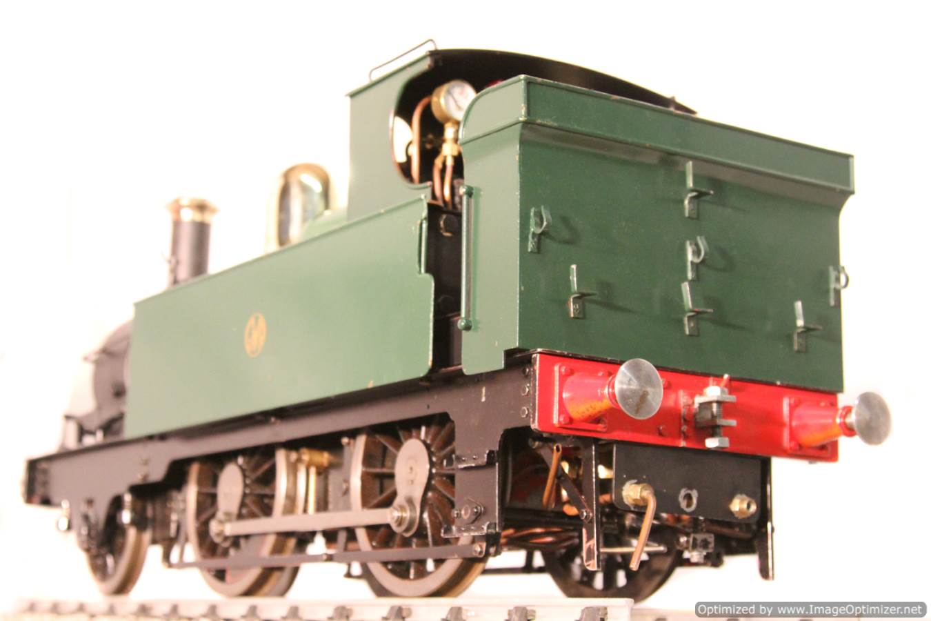 Here we have a nice example of the 5" gauge GWR 'metro' 2-4-0 tank. This is a crisp and competently made and machined model, that performs as well as it looks like it should. Made with a view toward running rather than excessive detail, everything has that satisfying combination of tightness but free movement. She is fitted with two injectors set up to be fed from a riding truck to keep the water cold, (the tanks are currently dry,..... and awaiting extra weight to be added if you should feel the need!). Lubrication is displacement, and again is well designed. There is a large reservoir below the footplate, with a good size condensing coil to turn the supply steam back into water. There is a long lever arm on the drain valve so that it is easy to operate, and an easy to see sight feed on the footplate.