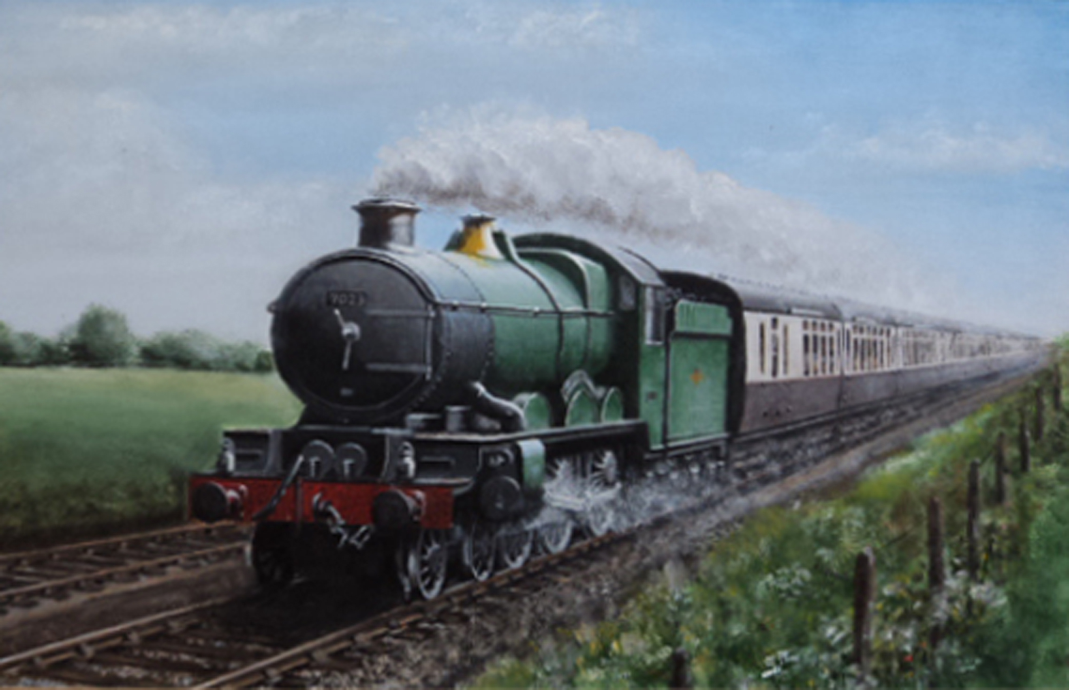 A framed original oil painting on board, depicting a view of a Great Western steam locomotive 7023 Penrice Castle.