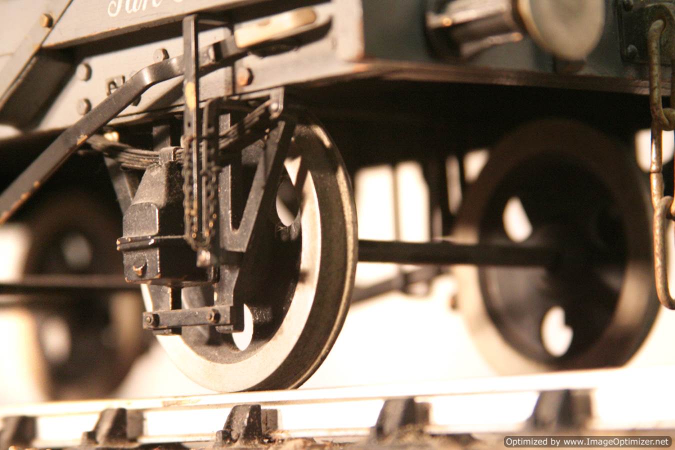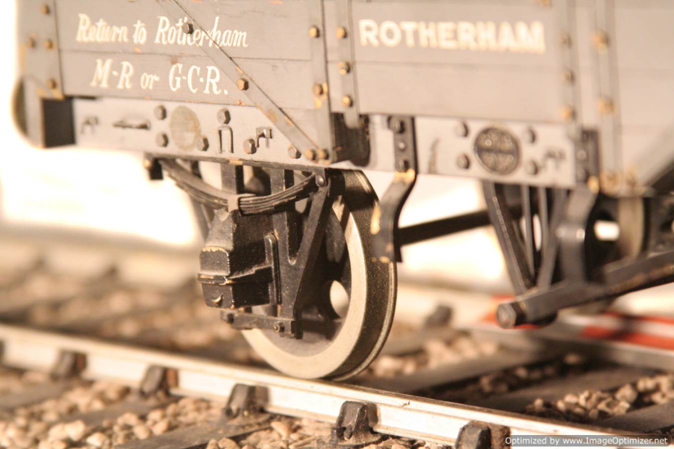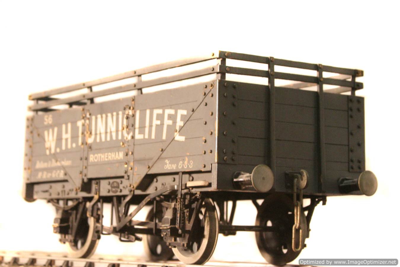 Here we have a rather beautifully made scale model of a wooden framed 5 plank mineral wagon. Built we think to 1/16th scale for 3 1/4" gauge. There is room to 'tweak' out the wheelsets to fit on 3 1/2" gauge, where the wagon will work, but look a little on the small side.