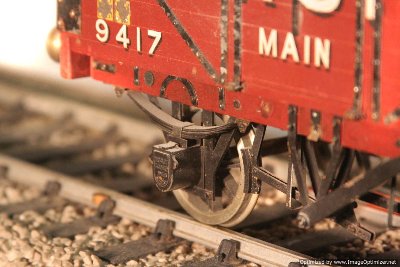 Here we have a rather beautifully made scale model of a wooden framed 7 plank mineral wagon. Built we think to 1/16th scale for 3 1/4" gauge. There is room to 'tweak' out the wheelsets to fit on 3 1/2" gauge, where the wagon will work, but look a little on the small side.
