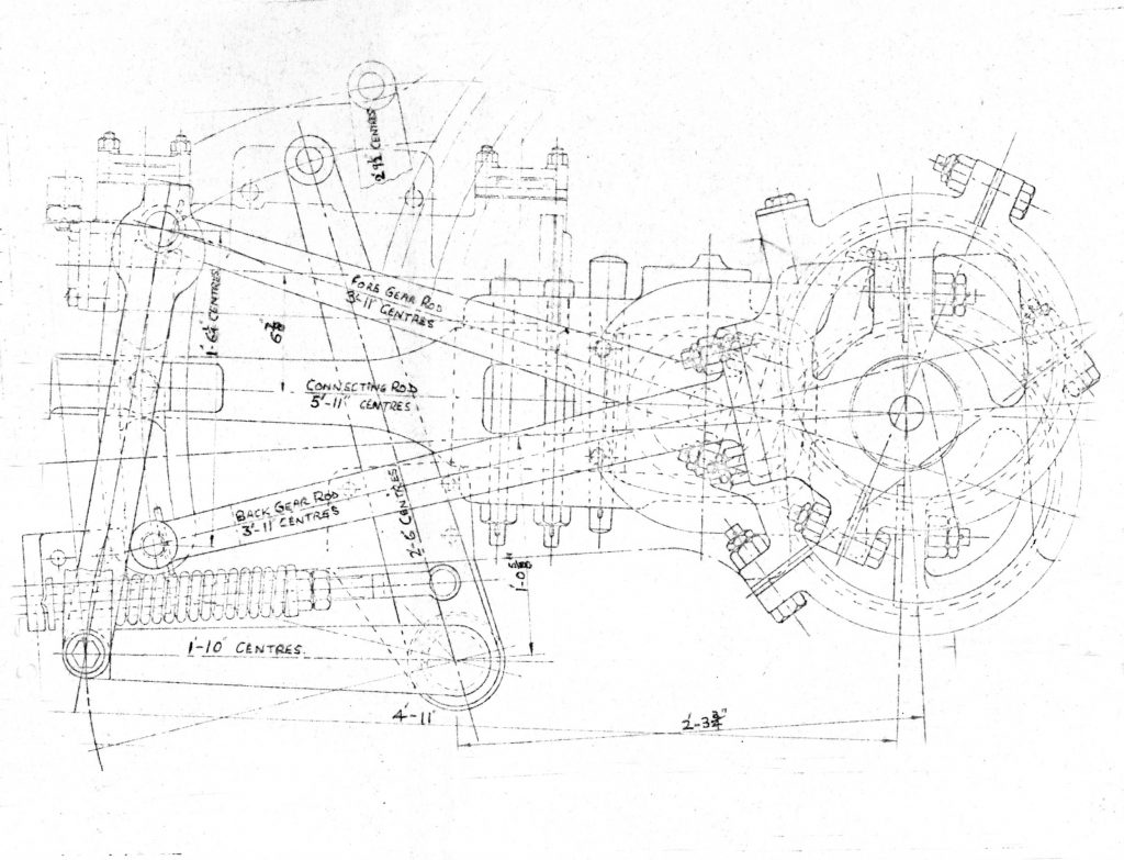 Because Stephenson’s gear can achieve near perfection in enabling a one-piece valve to supply both ends of a double-acting cylinder equally its design in any one particular case ought to follow a complete and correct procedure, in the knowledge that straying from its basic simplicity will impair its excellence. The primary tenet must be to achieve geometric symmetry, since any discrepancy will result in inequality of the valve events, either in forward gear or backgear, or in both. The gear comprises a straightforward eccentric drive for forward gear and another for reverse and should be kept so, including its suspension.