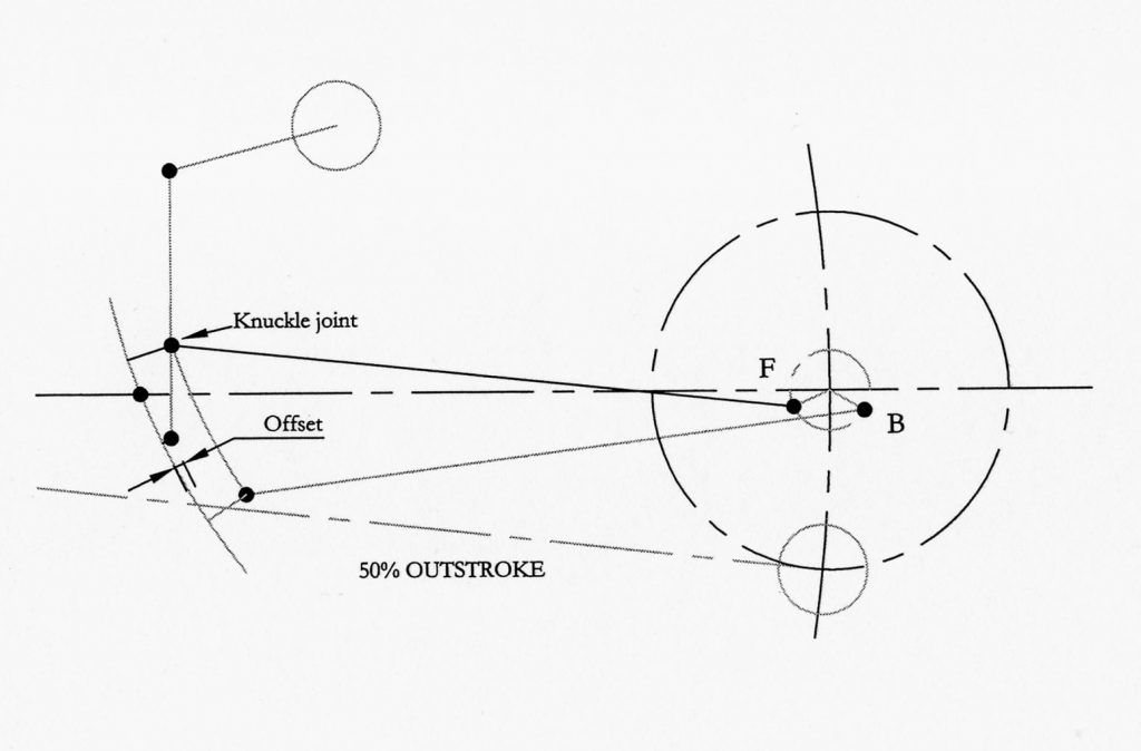 It is worthwhile tracing the extremities of pin travel for both forward and reverse gears on paper, joining and bisecting these full gear positions, and thereby seeking a common position for the lifting arm eye. Resort to the simulator may then suggest minor diversion to suit the running range.